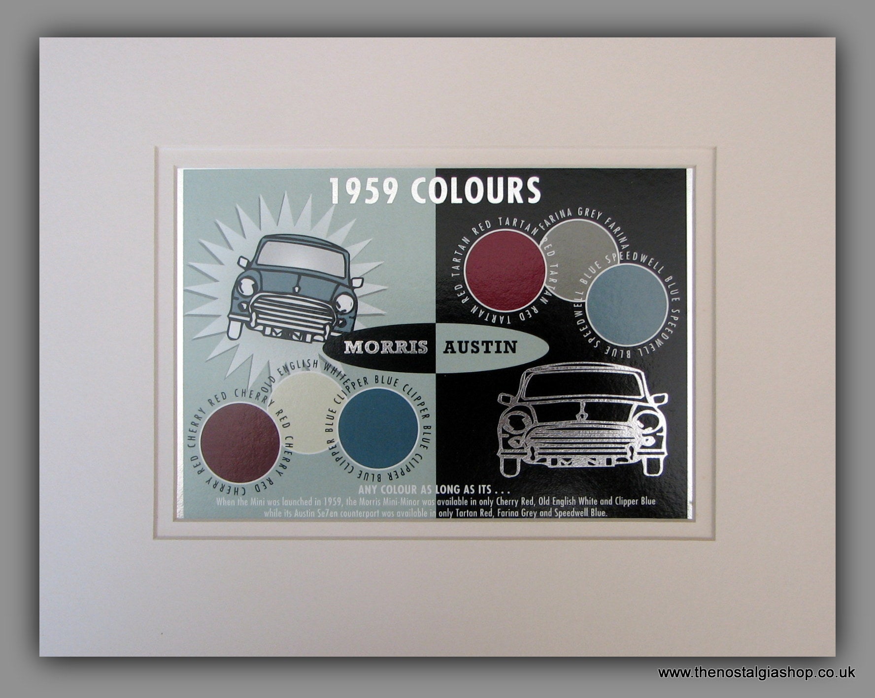 Mini 1959 Paint Colours. Print is presented in a double cream mount. Size of mount is 10 x 8 Inches. (A standard size for framing) Ready to frame. Will be well packed.