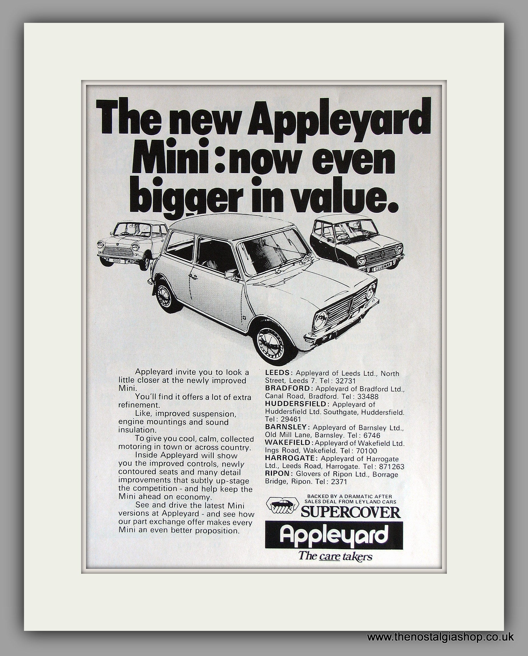 Mini. The new Appleyard Mini: now even bigger in value. Vintage Advert. Classic original advert 1976. Presented in cream bevel cut mount, Size 14 x 11 inches with backing card and clear bag. Ready to frame. Want it framing? If so, buy this then go to Frames Available Category. Click to buy on the suitable frame and we will do the rest. All our adverts, unless clearly stated are Originals from the date shown They make excellent pieces of wall art and stunning gifts. Many are rare and hard to find and once sold, may not be replaced. Remember you are buying a piece of history. Website watermark is not on original.