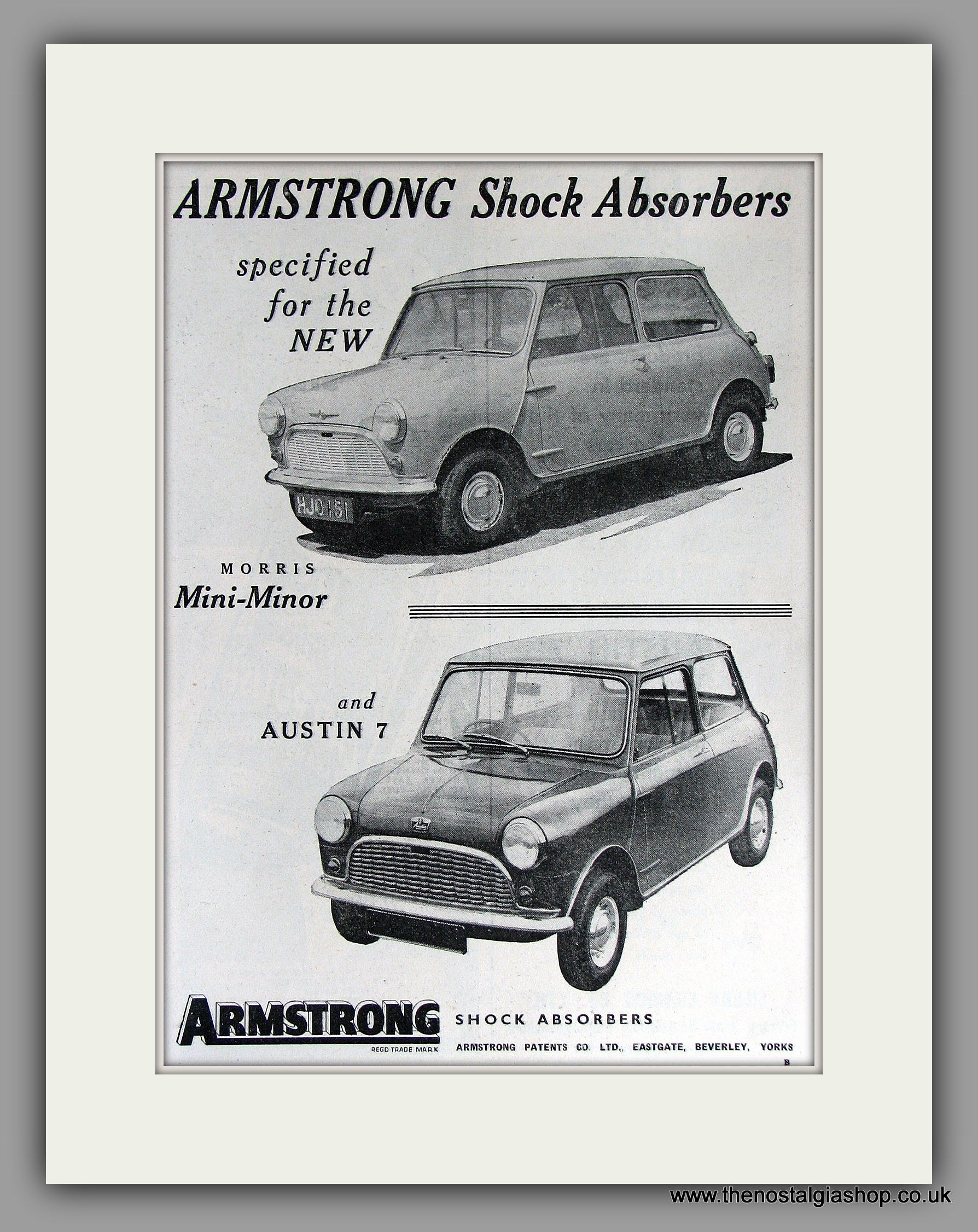 Mini Armstrong Shock Absorbers. Vintage Advert. Classic original advert 1959. Presented in cream bevel cut mount, Size 14 x 11 inches with backing card and clear bag. Ready to frame. Want it framing? If so, buy this then go to Frames Available Category. Click to buy on the suitable frame and we will do the rest. All our adverts, unless clearly stated are Originals from the date shown They make excellent pieces of wall art and stunning gifts. Many are rare and hard to find and once sold, may not be replaced. Remember you are buying a piece of history. Website watermark is not on original.