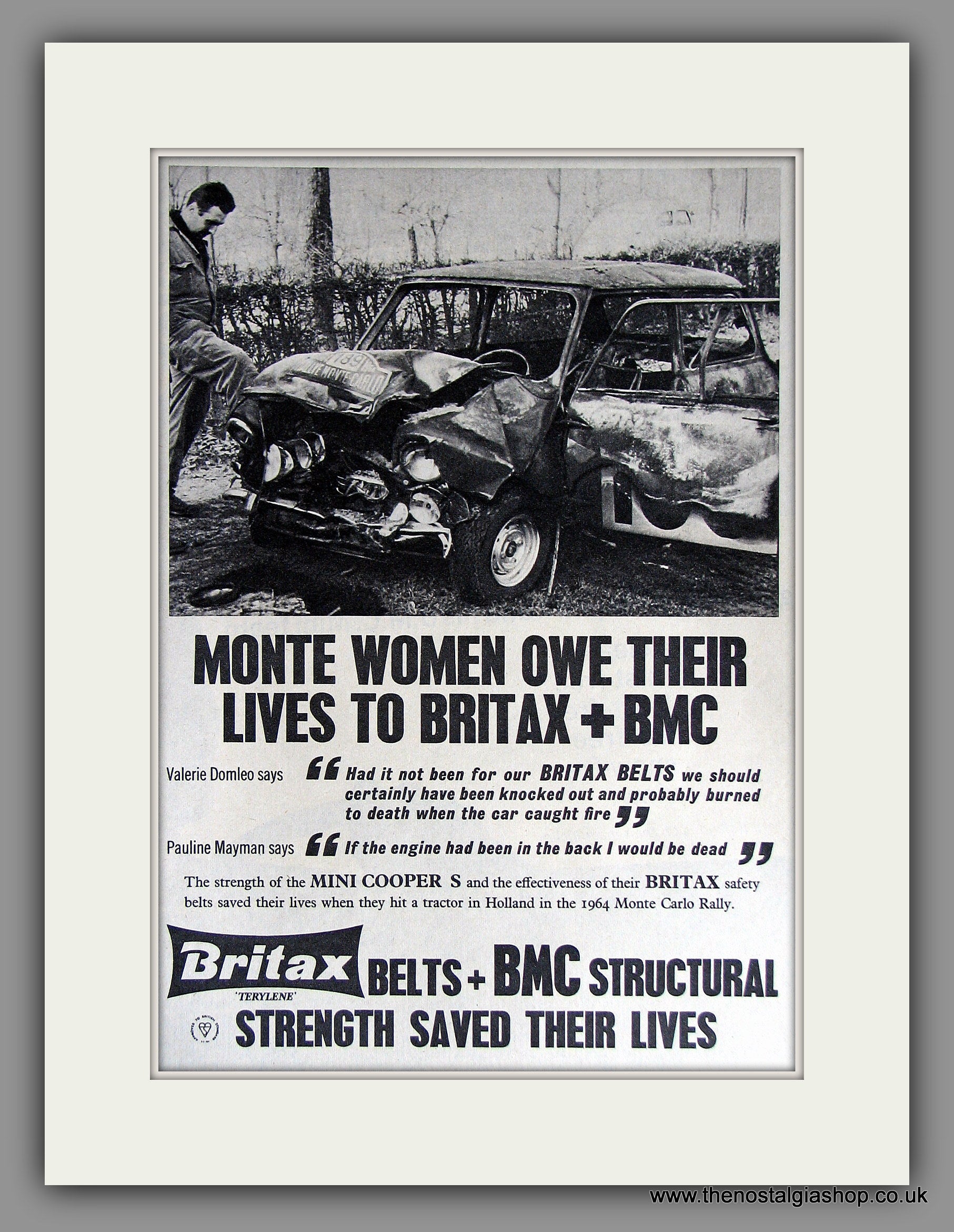 Mini Britax Belts. Vintage Advert. Classic original advert 1964. Presented in cream bevel cut mount, Size 14 x 11 inches with backing card and clear bag. Ready to frame. Want it framing? If so, buy this then go to Frames Available Category. Click to buy on the suitable frame and we will do the rest. All our adverts, unless clearly stated are Originals from the date shown They make excellent pieces of wall art and stunning gifts. Many are rare and hard to find and once sold, may not be replaced. Remember you are buying a piece of history. Website watermark is not on original.