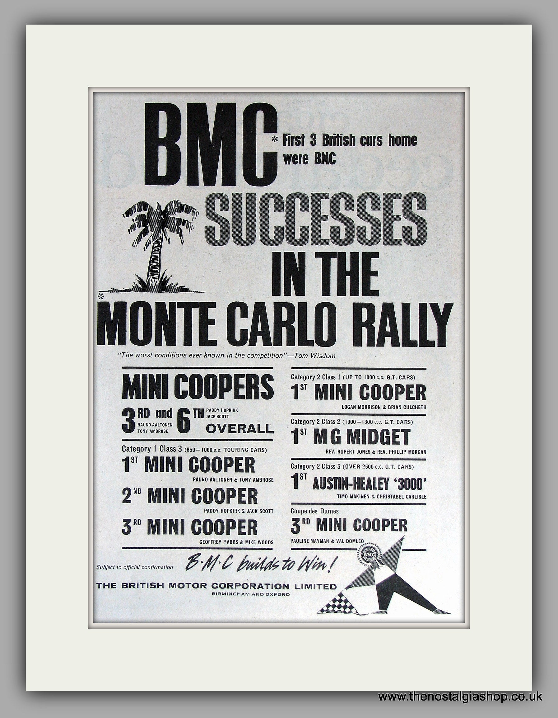 Mini Cooper S. BMC Sucesses in the Monte Carlo Rally. Vintage Advert. Classic original advert 1963. Presented in cream bevel cut mount, Size 14 x 11 inches with backing card and clear bag. Ready to frame. Want it framing? If so, buy this then go to Frames Available Category. Click to buy on the suitable frame and we will do the rest. All our adverts, unless clearly stated are Originals from the date shown They make excellent pieces of wall art and stunning gifts. Many are rare and hard to find and once sold, may not be replaced. Remember you are buying a piece of history. Website watermark is not on original.
