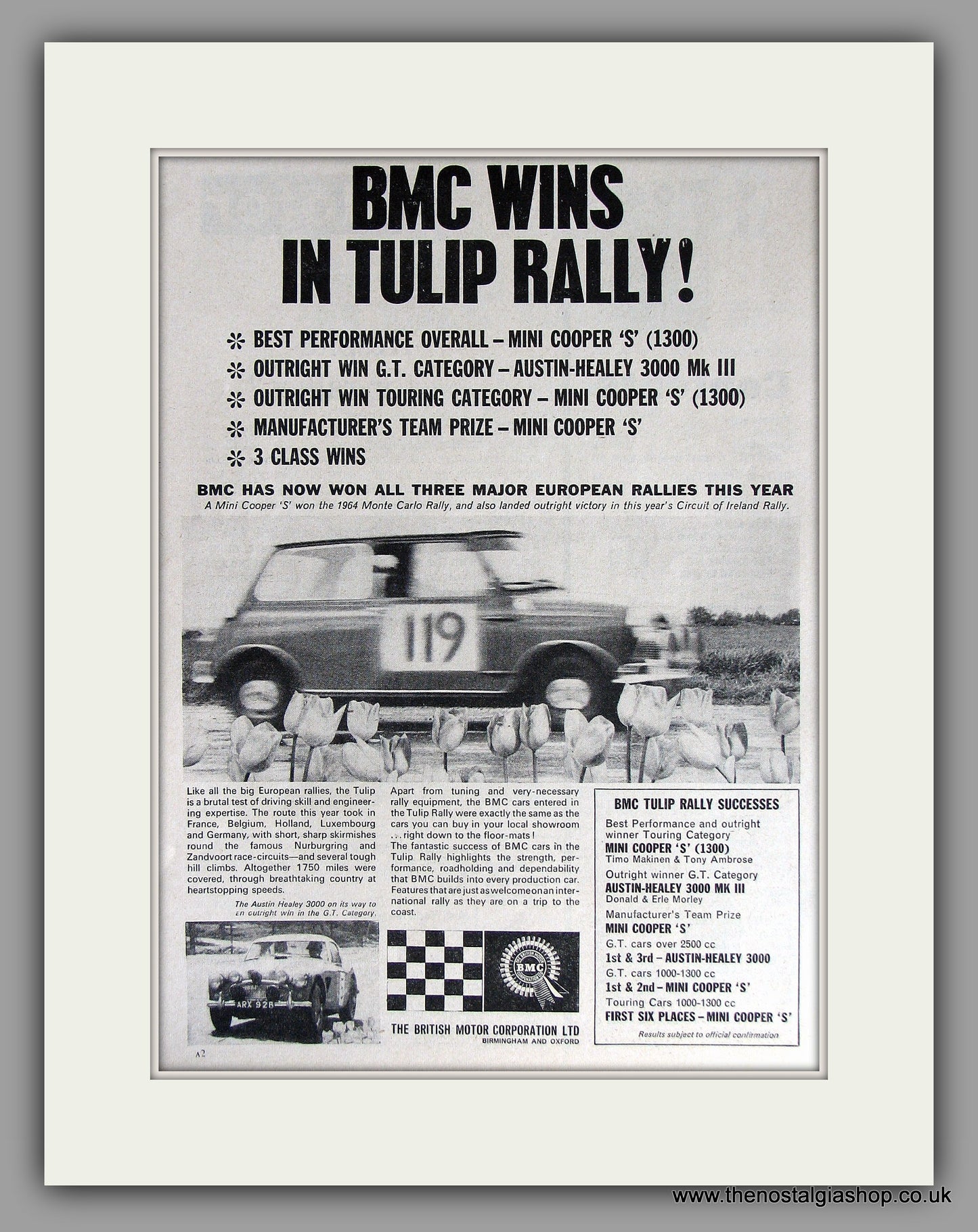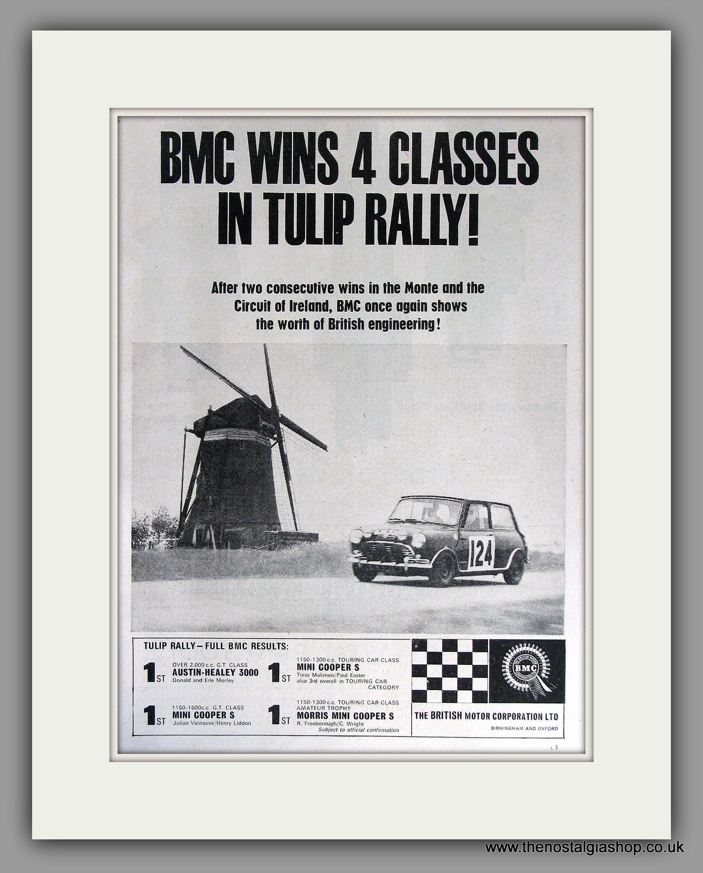 Mini Cooper S. BMC Winners in the Tulip Rally. Set of 2 Vintage Adverts. Classic original advert 1964 & 1965. Each is presented in cream bevel cut mount, Size 14 x 11 inches with backing card and clear bag. Ready to frame. Want them framing? If so, buy this then go to Frames Available Category. Click to buy on the suitable frames and we will do the rest. All our adverts, unless clearly stated are Originals from the date shown They make excellent pieces of wall art and stunning gifts. Many are rare and hard to find and once sold, may not be replaced. Remember you are buying a piece of history. Website watermark is not on original.