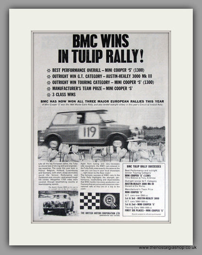 Mini Cooper S BMC Winners Tulip Rally 1964/65 Set of 2 Original Vintage Adverts (ref AD7818)