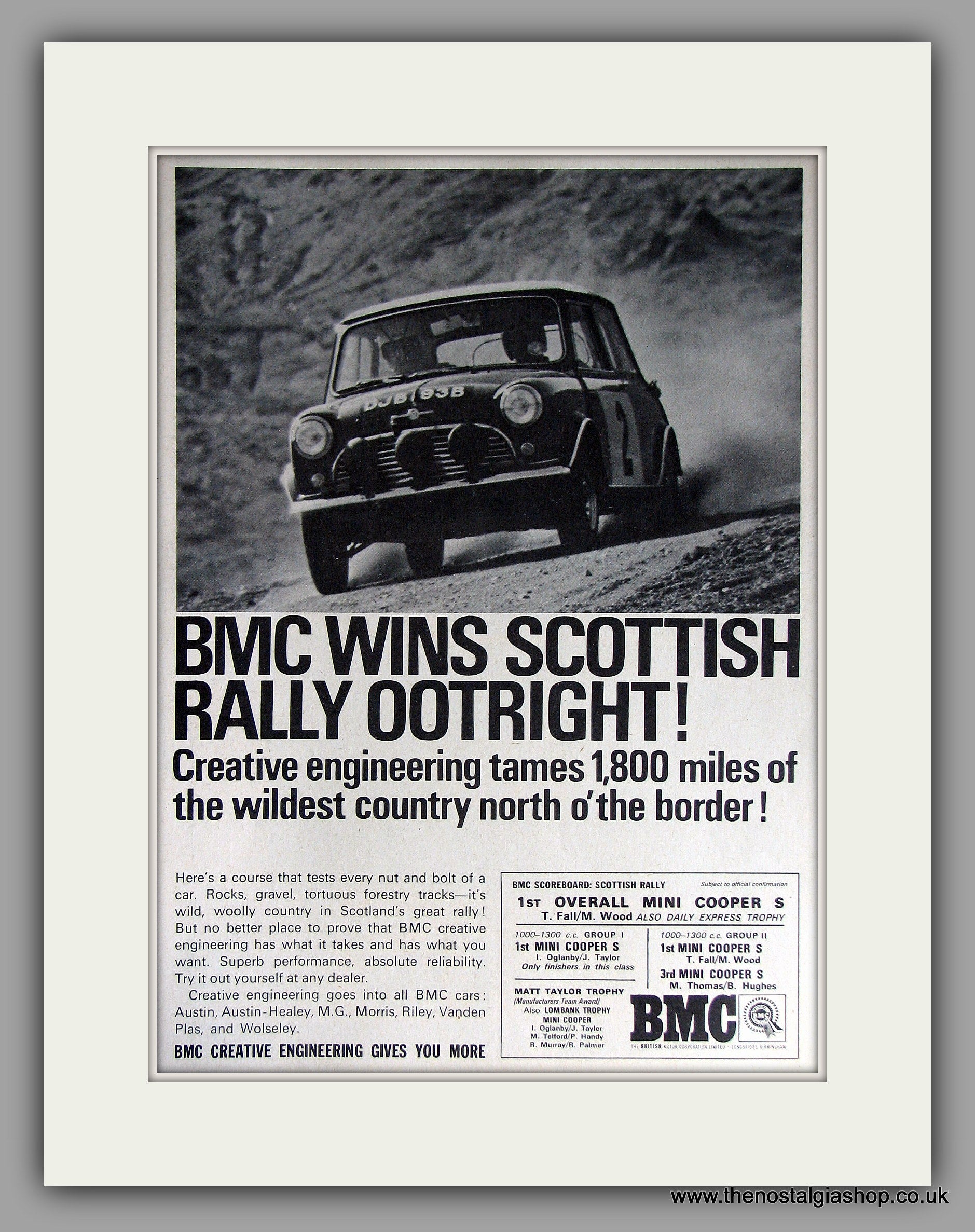 Mini Cooper S and BMC win The Scottish Rally. Vintage Advert. Classic original advert 1966. Presented in cream bevel cut mount, Size 14 x 11 inches with backing card and clear bag. Ready to frame. Want it framing? If so, buy this then go to Frames Available Category. Click to buy on the suitable frame and we will do the rest. All our adverts, unless clearly stated are Originals from the date shown They make excellent pieces of wall art and stunning gifts. Many are rare and hard to find and once sold, may not be replaced. Remember you are buying a piece of history. Website watermark is not on original.