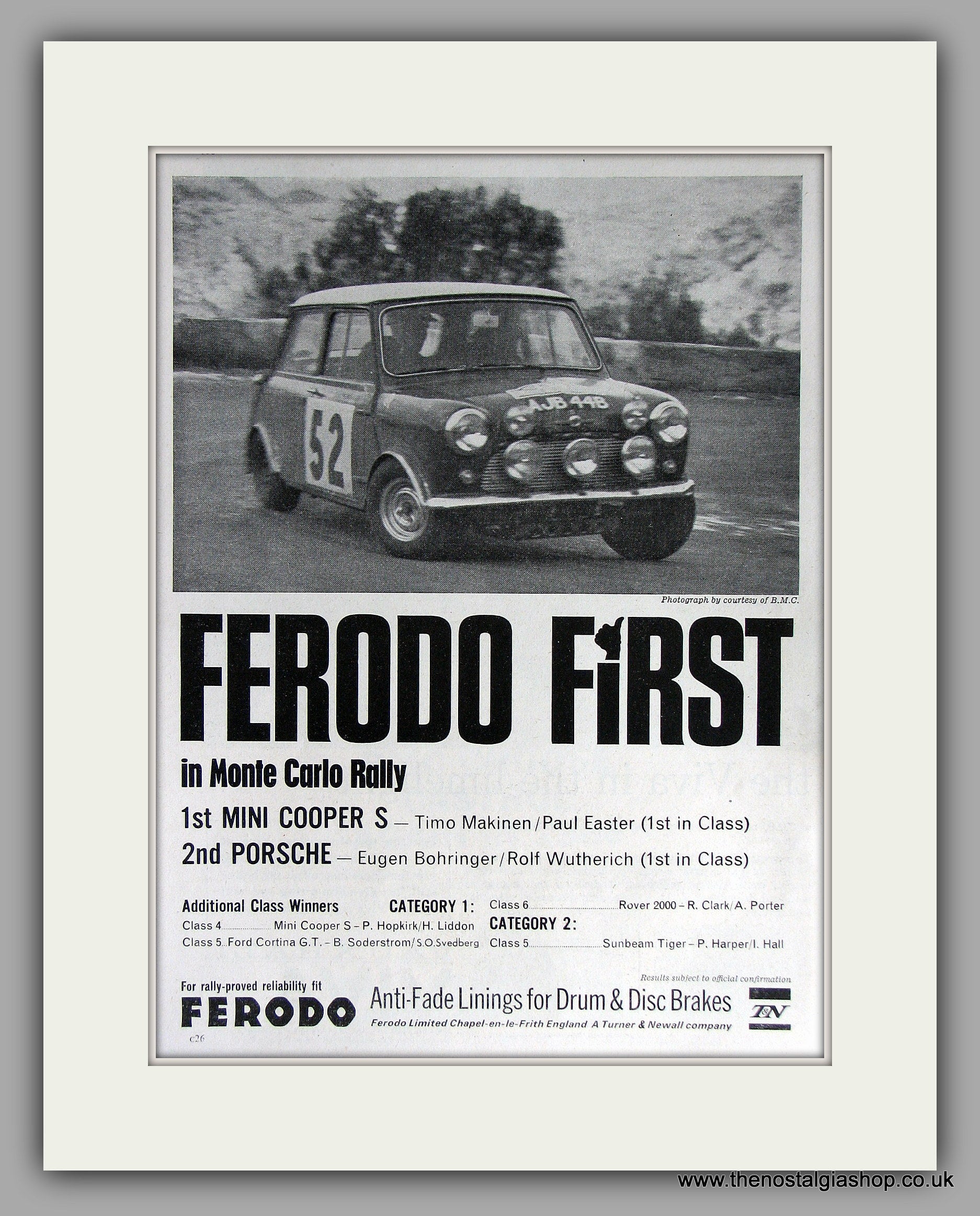 Mini Cooper S win Monte Carlo Rally Using Ferodo Brake Linings. Drivers Timo Makinen and Paul Easter. 1965. BMC. Vintage Advert. Classic original advert 1965. Presented in cream bevel cut mount, Size 14 x 11 inches with backing card and clear bag. Ready to frame. Want it framing? If so, buy this then go to Frames Available Category. Click to buy on the suitable frame and we will do the rest. All our adverts, unless clearly stated are Originals from the date shown They make excellent pieces of wall art and stunning gifts. Many are rare and hard to find and once sold, may not be replaced. Remember you are buying a piece of history. Website watermark is not on original.