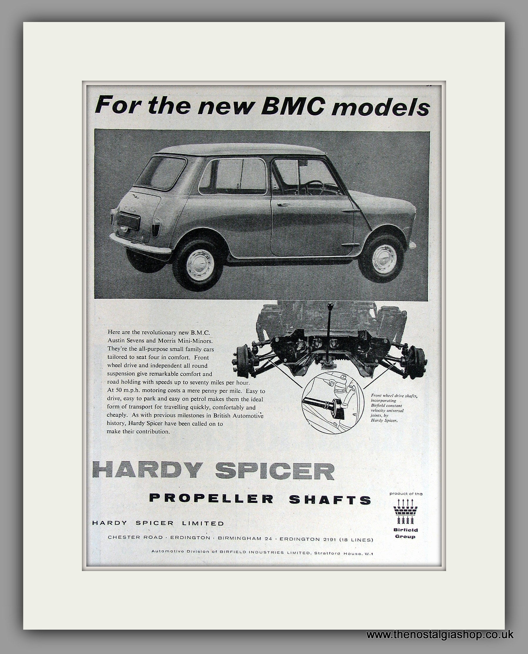 Mini Hardy Spicer Propeller Shafts. Vintage Advert. Classic original advert 1959. Presented in cream bevel cut mount, Size 14 x 11 inches with backing card and clear bag. Ready to frame. Want it framing? If so, buy this then go to Frames Available Category. Click to buy on the suitable frame and we will do the rest. All our adverts, unless clearly stated are Originals from the date shown They make excellent pieces of wall art and stunning gifts. Many are rare and hard to find and once sold, may not be replaced. Remember you are buying a piece of history. Website watermark is not on original.
