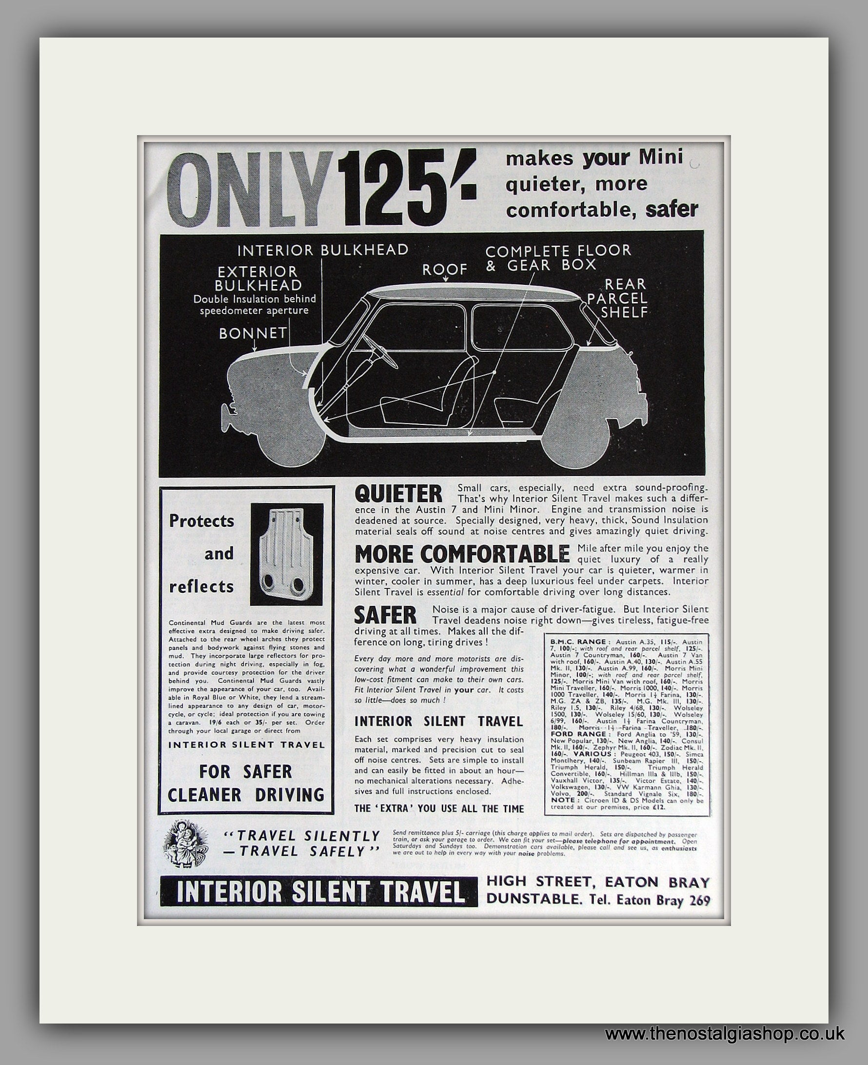 Mini Interior Silent Travel. Vintage Advert. Classic original advert 1961. Presented in cream bevel cut mount, Size 14 x 11 inches with backing card and clear bag. Ready to frame. Want it framing? If so, buy this then go to Frames Available Category. Click to buy on the suitable frame and we will do the rest. All our adverts, unless clearly stated are Originals from the date shown They make excellent pieces of wall art and stunning gifts. Many are rare and hard to find and once sold, may not be replaced. Remember you are buying a piece of history. Website watermark is not on original.