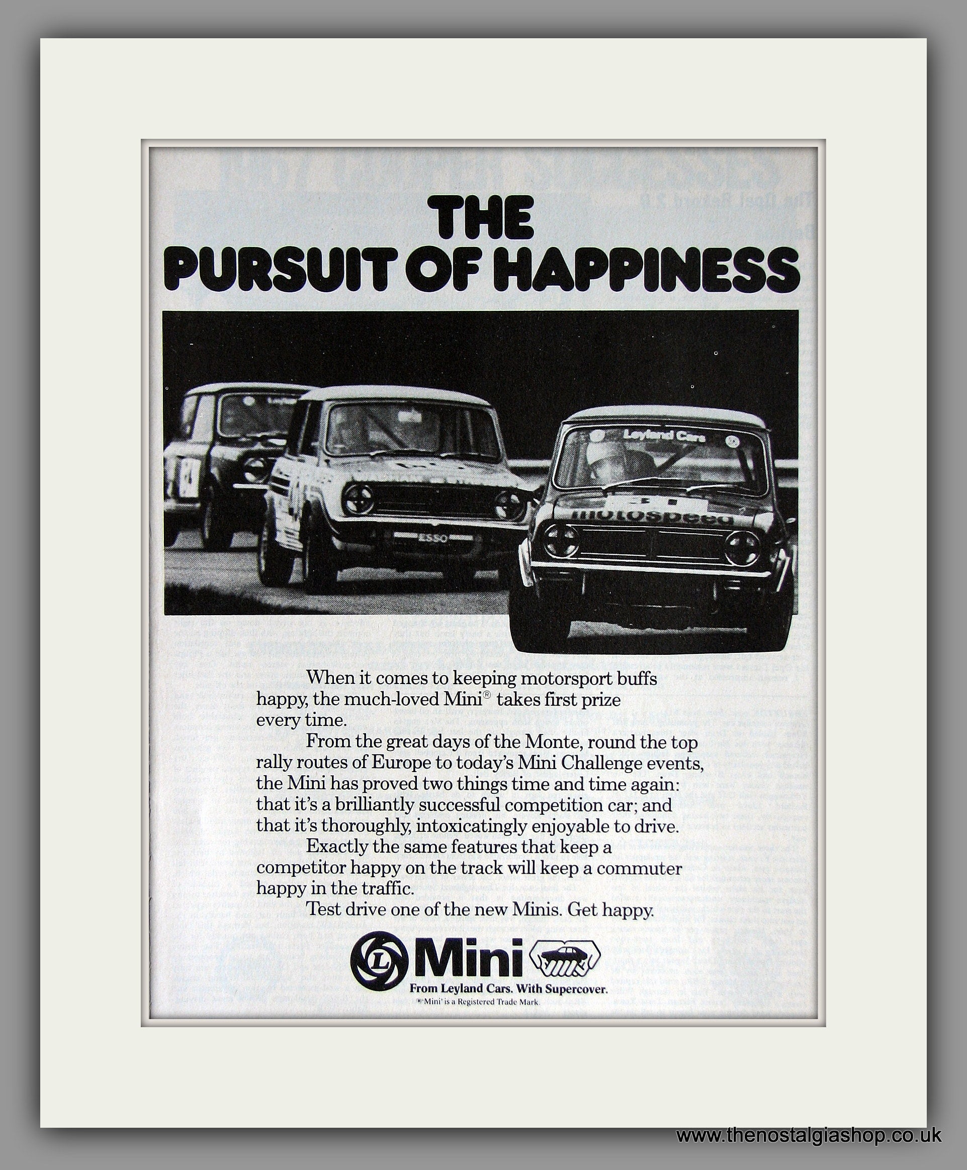 Mini, The Pursuit of Happiness. Vintage Advert. Classic original advert 1978. Presented in cream bevel cut mount, Size 14 x 11 inches with backing card and clear bag. Ready to frame. Want it framing? If so, buy this then go to Frames Available Category. Click to buy on the suitable frame and we will do the rest. All our adverts, unless clearly stated are Originals from the date shown They make excellent pieces of wall art and stunning gifts. Many are rare and hard to find and once sold, may not be replaced. Remember you are buying a piece of history. Website watermark is not on original.