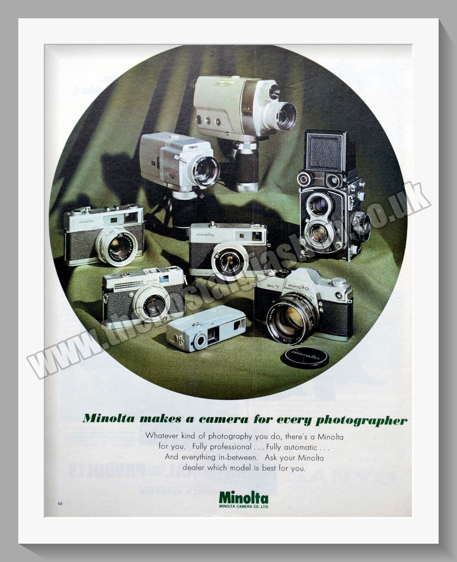 Minolta Camera Range. Double Vintage Advert. Classic Original Advert 1970. Presented and Supplied in a cream bevel cut mount with backing card and clear bag. Each is ready to fit in 18 x 14 inch frames. Will be well packed with a sheet of hardboard to keep the mounted Advert flat. All our adverts, unless clearly stated are Originals from the date shown. They make excellent pieces of wall art and stunning gifts. Many are rare and hard to find and once sold, may not be replaced. Remember you are buying a piece of history. Website watermark is not on original. Vintage Cameras, Old Cameras.