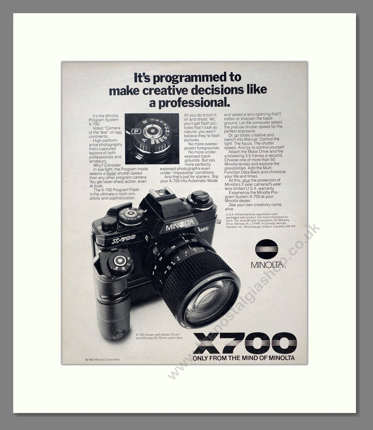 Minolta - X700. Vintage Advert. This is a large classic original advert from 1983. Presented and supplied in a cream bevel cut mount with backing card and clear bag. Ready to fit in a 18 x 14 inches frame. The mounted advert will be posted via courier and well packed - protected with a sheet of hardboard to keep it rigid. Any questions or enquiries, please get in touch, we are here to help! All our adverts, unless clearly stated are originals from the date shown. They make excellent pieces of wall art and stunning gifts. Many are rare and hard to find and once sold, may not be replaced. Remember you are buying a piece of history. Website watermark is not on original.