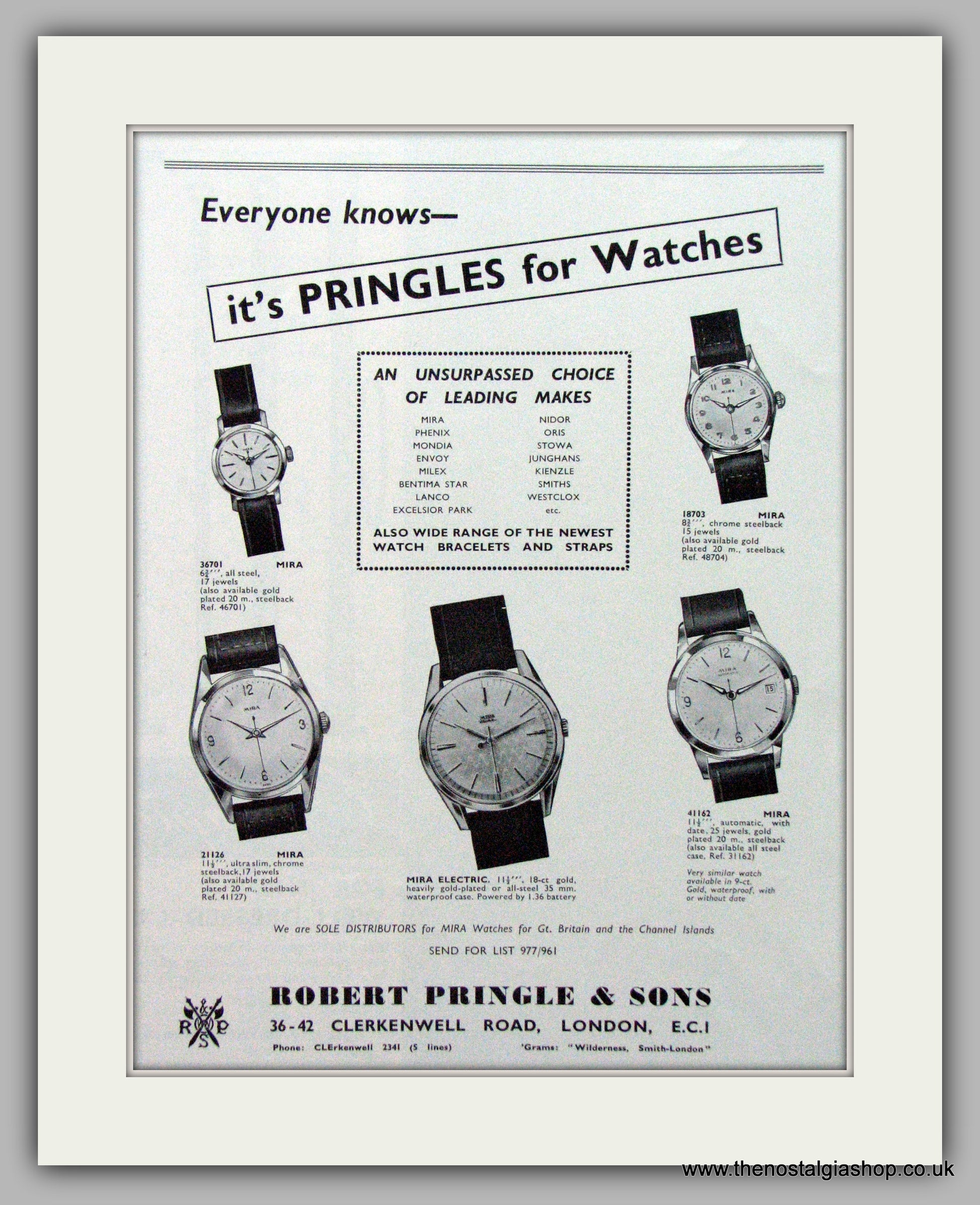 Mira Watches. Robert Pringle & Sons. Vintage Advert. Original Advert 1962. Presented in cream bevel cut mount with backing card and clear bag. Ready to fit in 14 x 11 inch frame. Want it framing? If so, buy this then go to Frames Available Category. Click to buy on the suitable frame(s) and we will do the rest. All our adverts, unless clearly stated are Originals from the date shown. They make excellent pieces of wall art and stunning gifts. Many are rare and hard to find and once sold, may not be replaced. Remember you are buying a piece of history. Website watermark is not on original.
