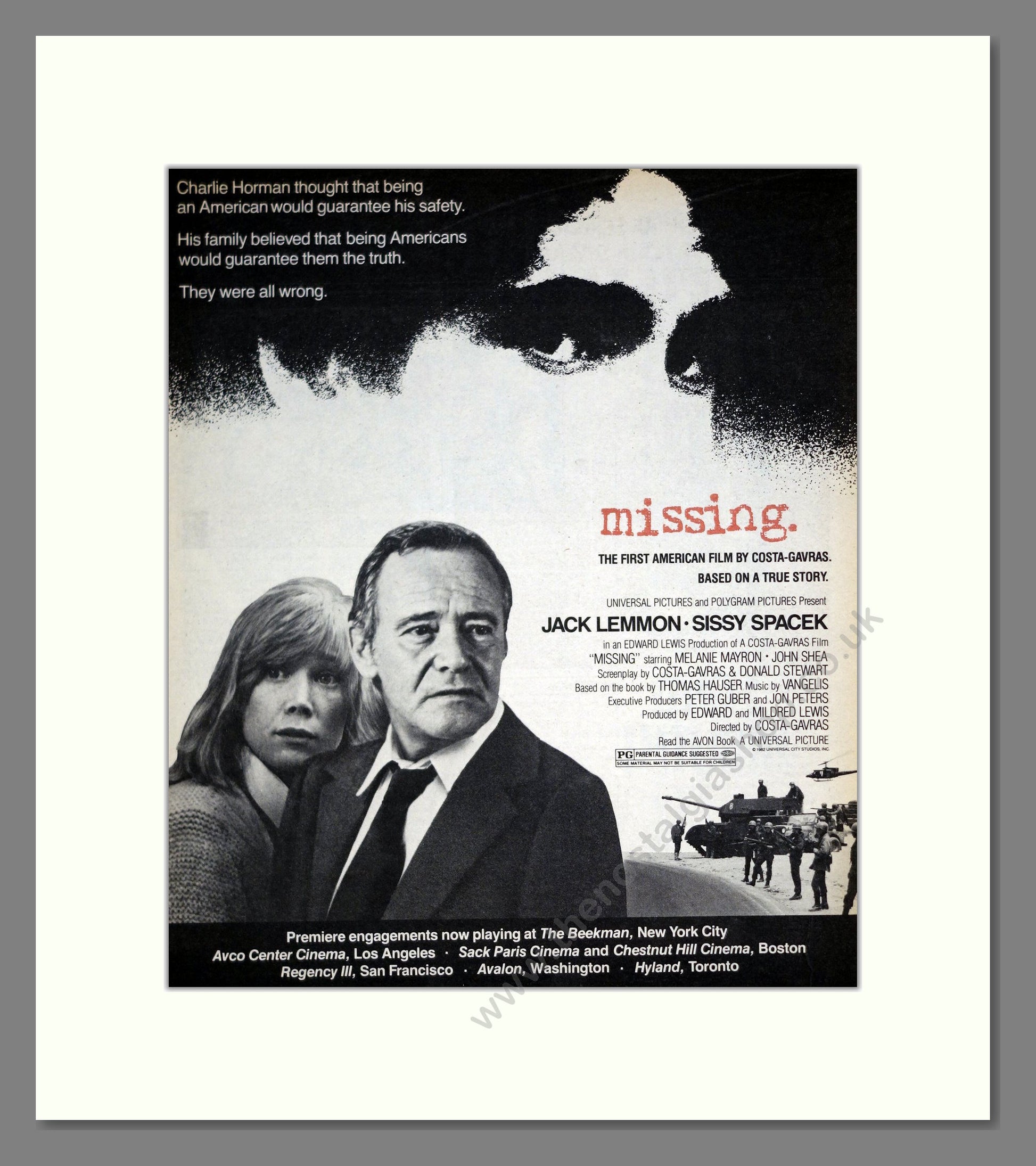 Missing. Jack Lemon, Sissy Spacek. Vintage Advert. This is a large Original Advert from 1982. Presented and supplied in a cream bevel cut mount with backing card and clear bag. Ready to fit in a 18 x 14 inches frame. The mounted advert will be posted via courier and well packed - protected with a sheet of hardboard to keep it rigid. Any questions or enquiries, please get in touch, we are here to help! All our adverts, unless clearly stated are originals from the date shown. They make excellent pieces of wall art and stunning gifts. Many are rare and hard to find and once sold, may not be replaced. Remember you are buying a piece of history. Website watermark is not on original.
