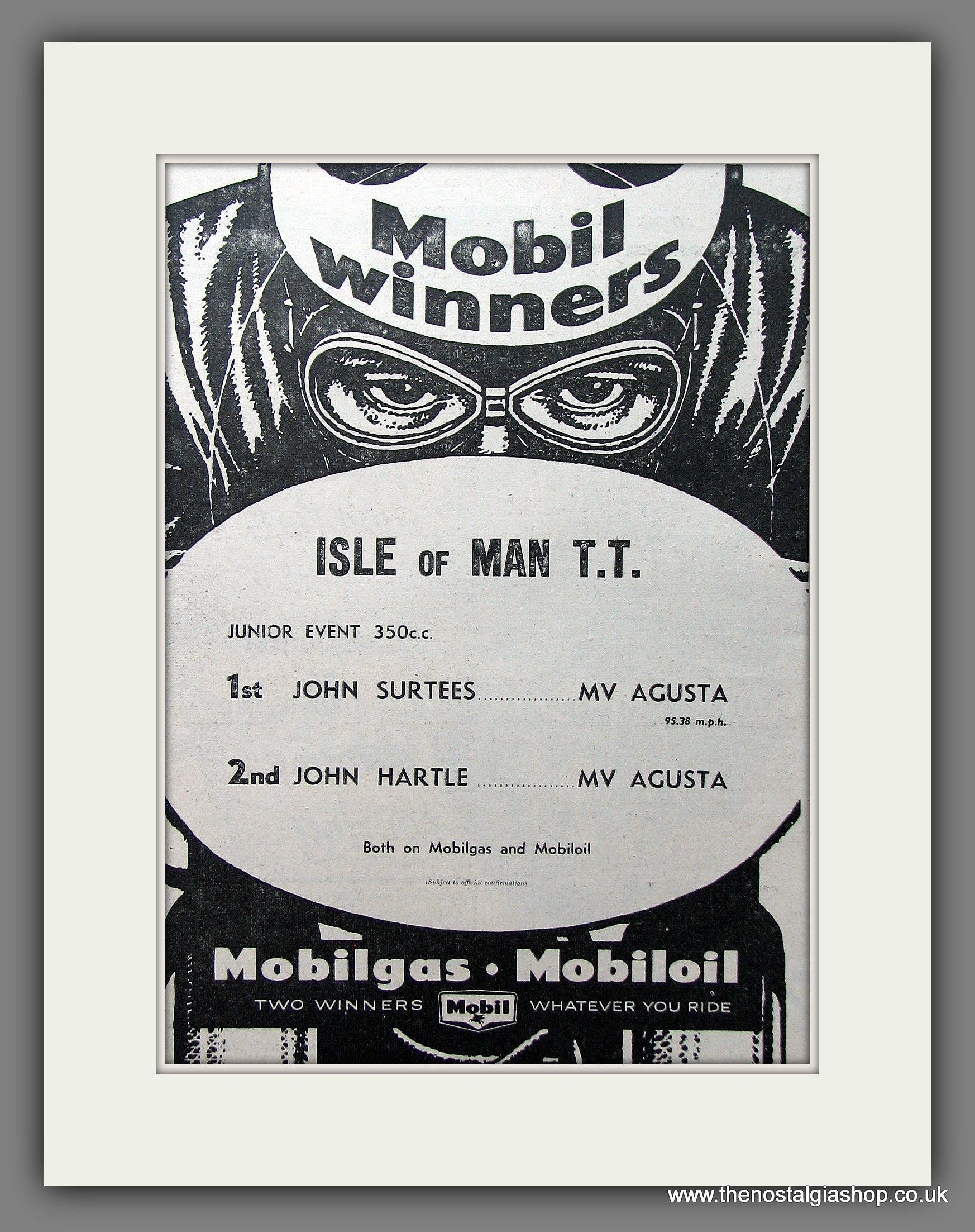 Mobiloil Winning The T.T. John Surtees. Classic original advert 1959. Presented in cream bevel cut mount with backing card. Ready to fit in 14 x 11 inch frame. Want it framing? If so, buy this then go to Frames Available Category. Click to buy on the suitable frame and we will do the rest. All our adverts, unless clearly stated are Originals from the date shown They make excellent pieces of wall art and stunning gifts. Many are rare and hard to find and once sold, may not be replaced. Remember you are buying a piece of history. Website watermark is not on original.