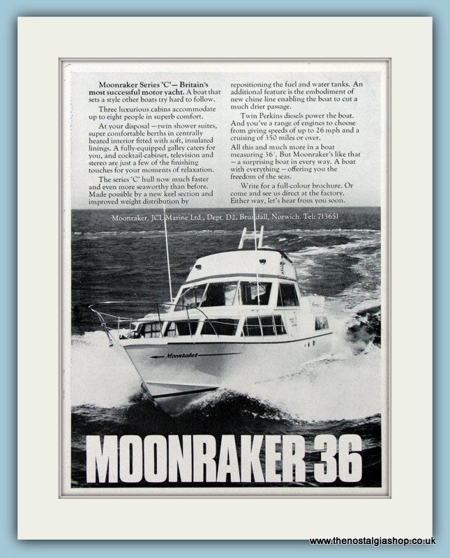 Moonraker 36 Motor Yacht. Moonraker series 'C' -Britain's most successful motor yacht. Classic original advert 1973. Presented in cream bevel cut mount with backing card. Ready to fit in 14 x 11 inch frame. Want it framing? If so, buy this then go to Frames Available Category. Click to buy on the suitable frame and we will do the rest. All our adverts, unless clearly stated are Originals from the date shown. They make excellent pieces of wall art and stunning gifts. Many are rare and hard to find and once sold, may not be replaced. Remember you are buying a piece of history. Website watermark is not on original.