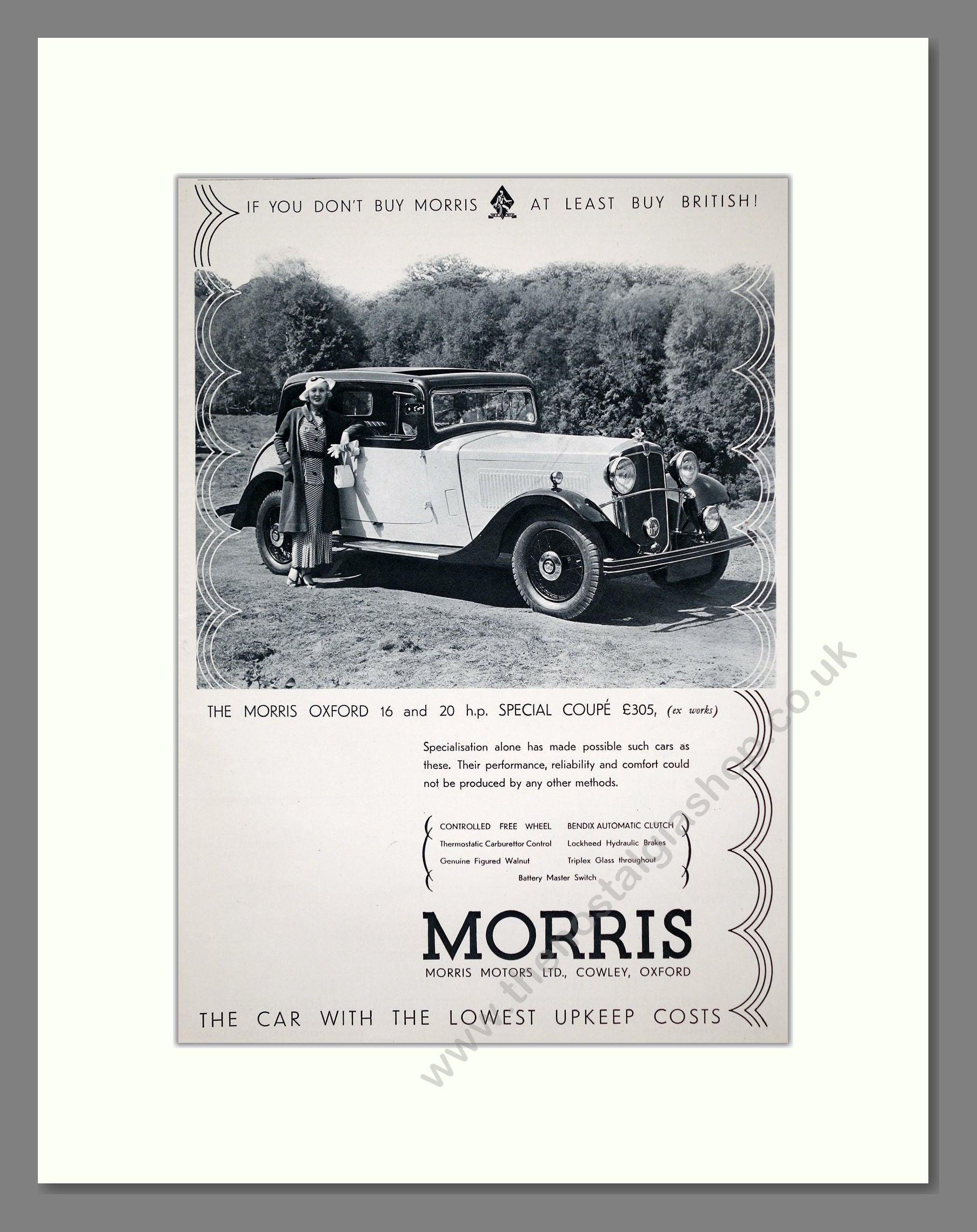 Morris Oxford Special Coupe. Original Vintage Advert 1934. Presented and Supplied in a cream bevel cut mount with backing card and clear bag. Ready to fit in 17.5 x 13.5 inch frame. All our adverts, unless clearly stated are Originals from the date shown They make excellent pieces of wall art and stunning gifts. Many are rare and hard to find and once sold, may not be replaced. Remember you are buying a piece of history. Website watermark is not on original.