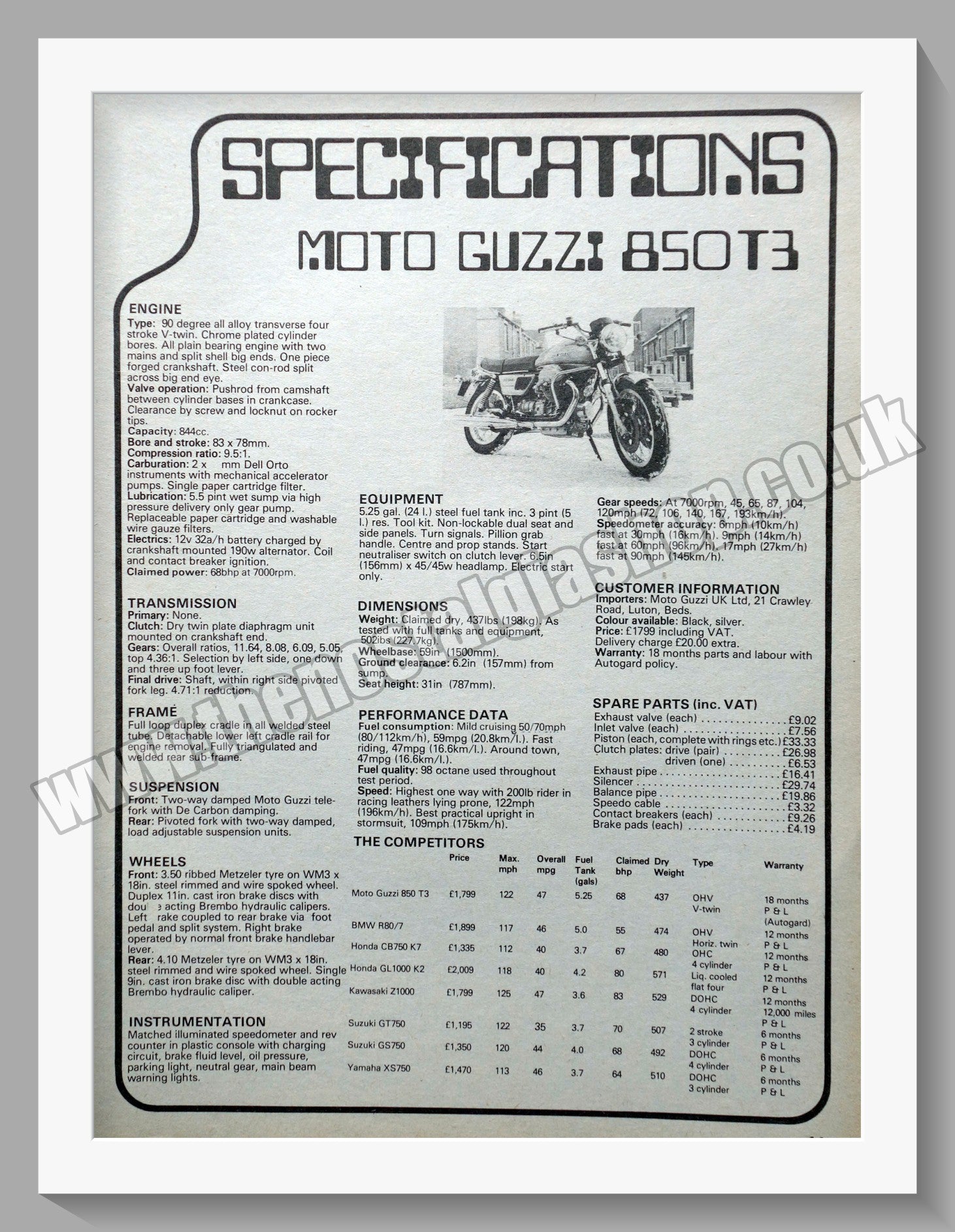 Moto Guzzi 850T3 Motorcycle Specifications. Original Advert 1978 (ref AD56672)