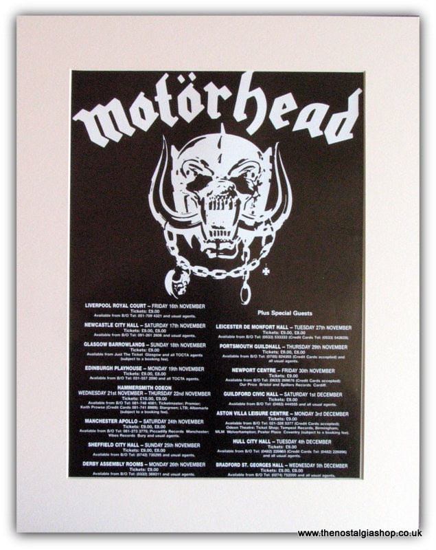 Motorhead 1990 Tour Advert. Lemmy. Manchester, Newcastle, Portsmouth, Glasgow, Sheffield, Derby. Classic original advert 1990. Presented in cream bevel cut mount with backing card. Ready to fit in 14 x 11 inch frame. Want it framing? buy this then go to Frames Available Category. Click to buy on the suitable frame and we will do the rest. All our adverts, unless clearly stated are Originals from the date shown They make excellent pieces of wall art and stunning gifts. Many are rare and hard to find and once sold, may not be replaced. Remember you are buying a piece of history. Website watermark is not on original.