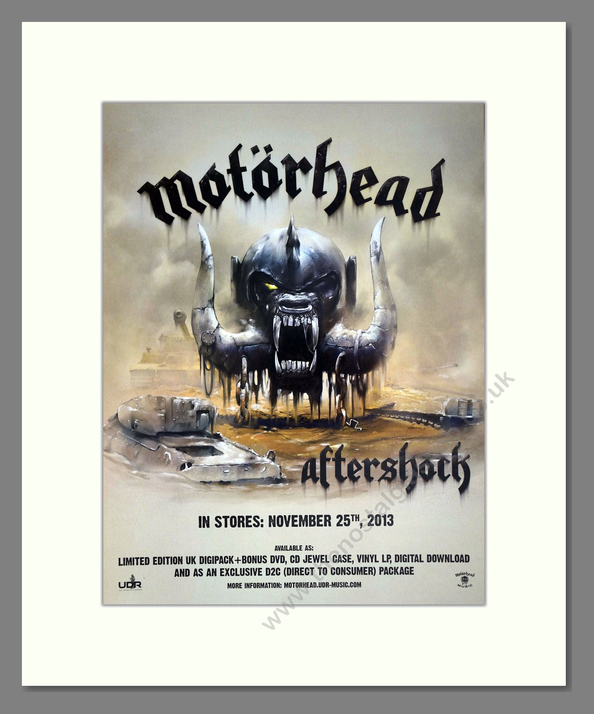 Motorhead - Aftershock. Vintage Advert. This is a classic original advert from 2013. Presented and supplied in a cream bevel cut mount with backing card and clear bag. Ready to fit in a 14 x 11 inches frame. The mounted advert will be posted via courier and well packed - protected with a sheet of hardboard to keep it rigid. Any questions or enquiries, please get in touch, we are here to help! All our adverts, unless clearly stated are originals from the date shown. They make excellent pieces of wall art and stunning gifts. Many are rare and hard to find and once sold, may not be replaced. Remember you are buying a piece of history. Website watermark is not on original.