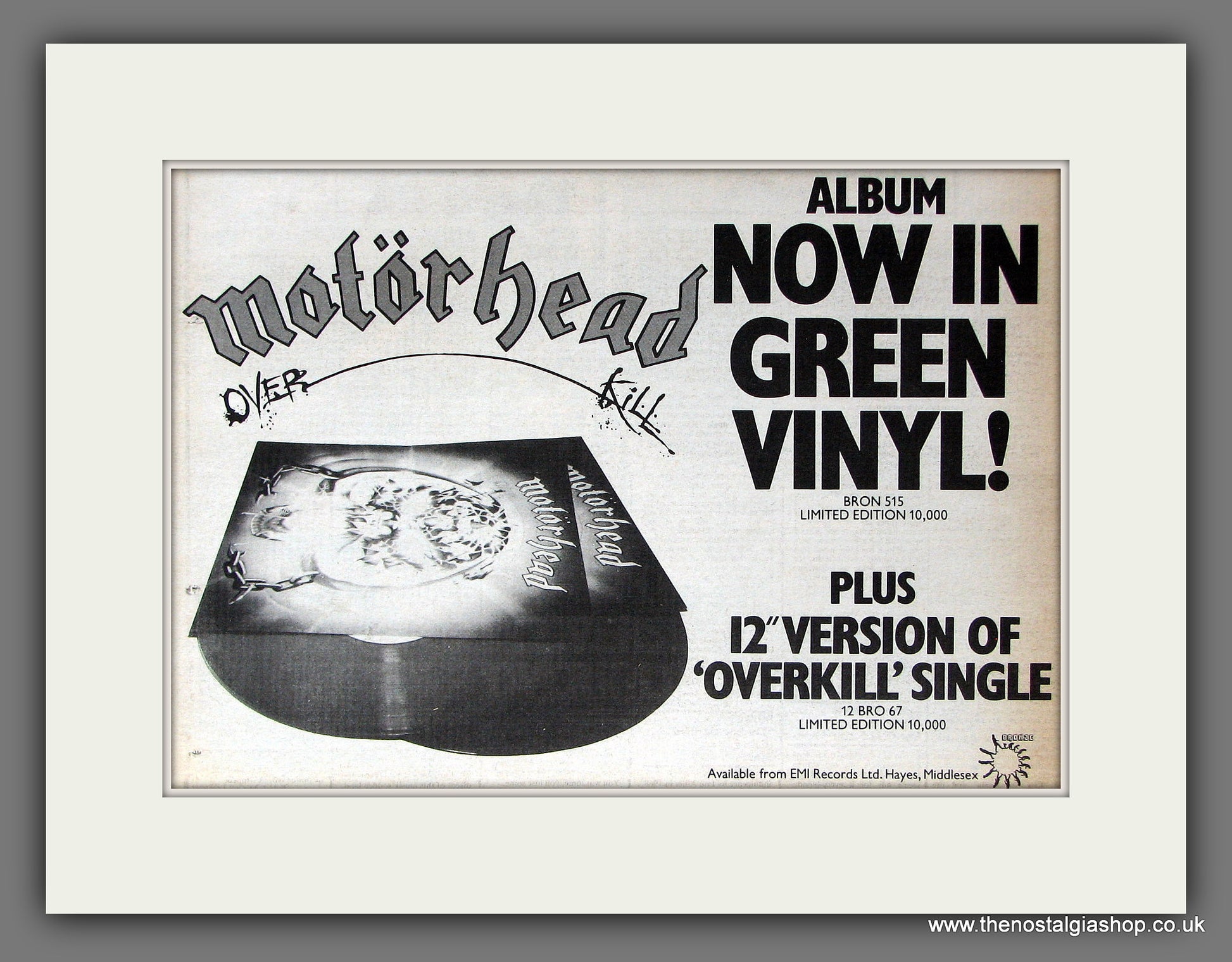 Motorhead Overkill. Classic Original advert 1979. Presented and supplied in a cream bevel cut mount with backing card and clear bag. Ready to fit in 14 x 11 inch frame. The mounted advert will be posted via courier and well packed - protected with a sheet of hardboard to keep it rigid. Any questions or inquiries, please get in touch, we are here to help! All our adverts, unless clearly stated are Originals from the date shown. They make excellent pieces of wall art and stunning gifts. Many are rare and hard to find and once sold, may not be replaced. Remember you are buying a piece of history. Website watermark is not on original.
