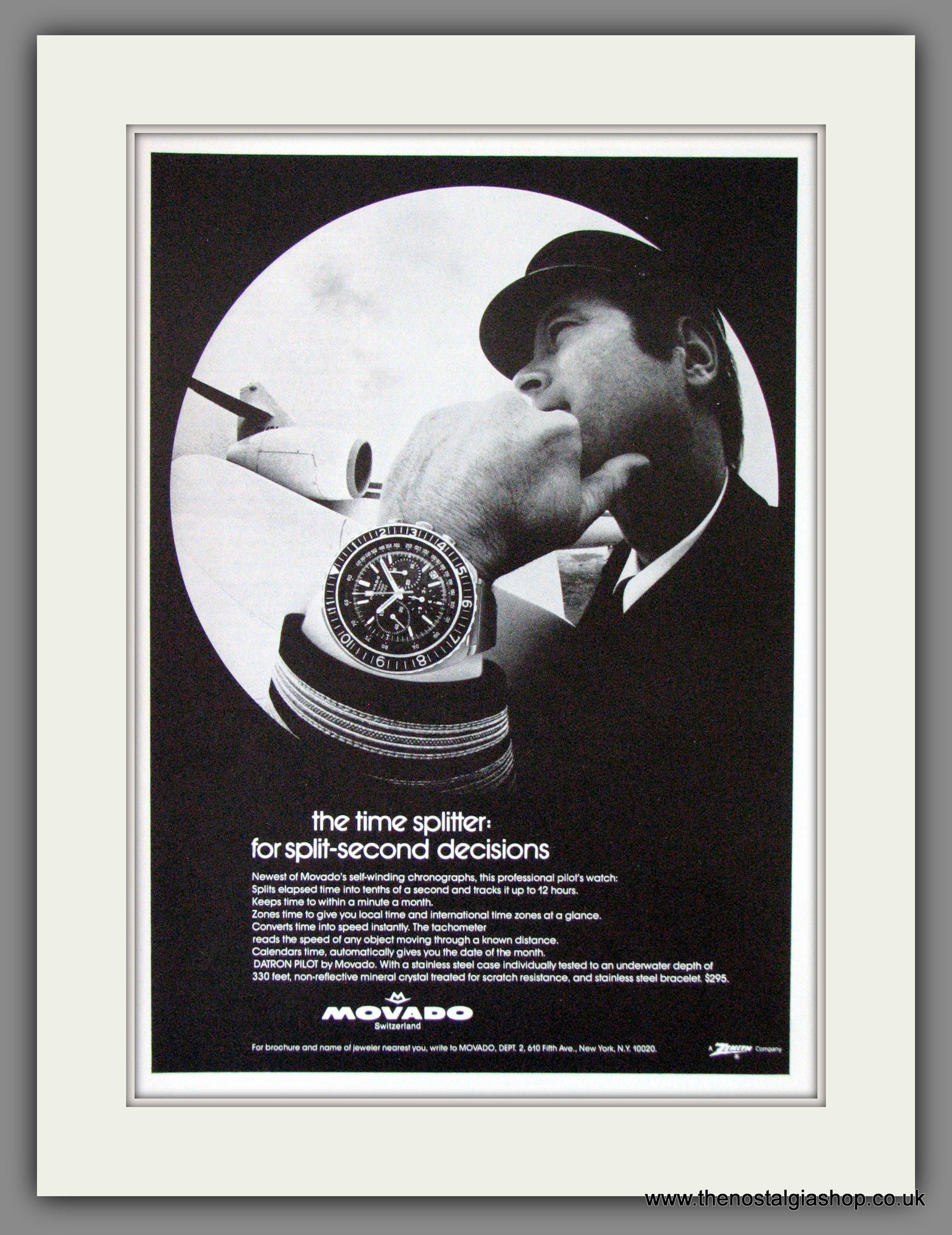 Movado Datron Pilot Watch. Classic Original Advert 1972. Presented and supplied in a cream bevel cut mount with backing card and clear bag. Ready to fit in 14 x 11 inch frame. Want it framing? If so, buy this then go to Frames Available Category. Click to buy on the suitable frame and we will do the rest. All our adverts, unless clearly stated are Originals from the date shown. They make excellent pieces of wall art and stunning gifts. Many are rare and hard to find and once sold, may not be replaced. Remember you are buying a piece of history. Website watermark is not on original.