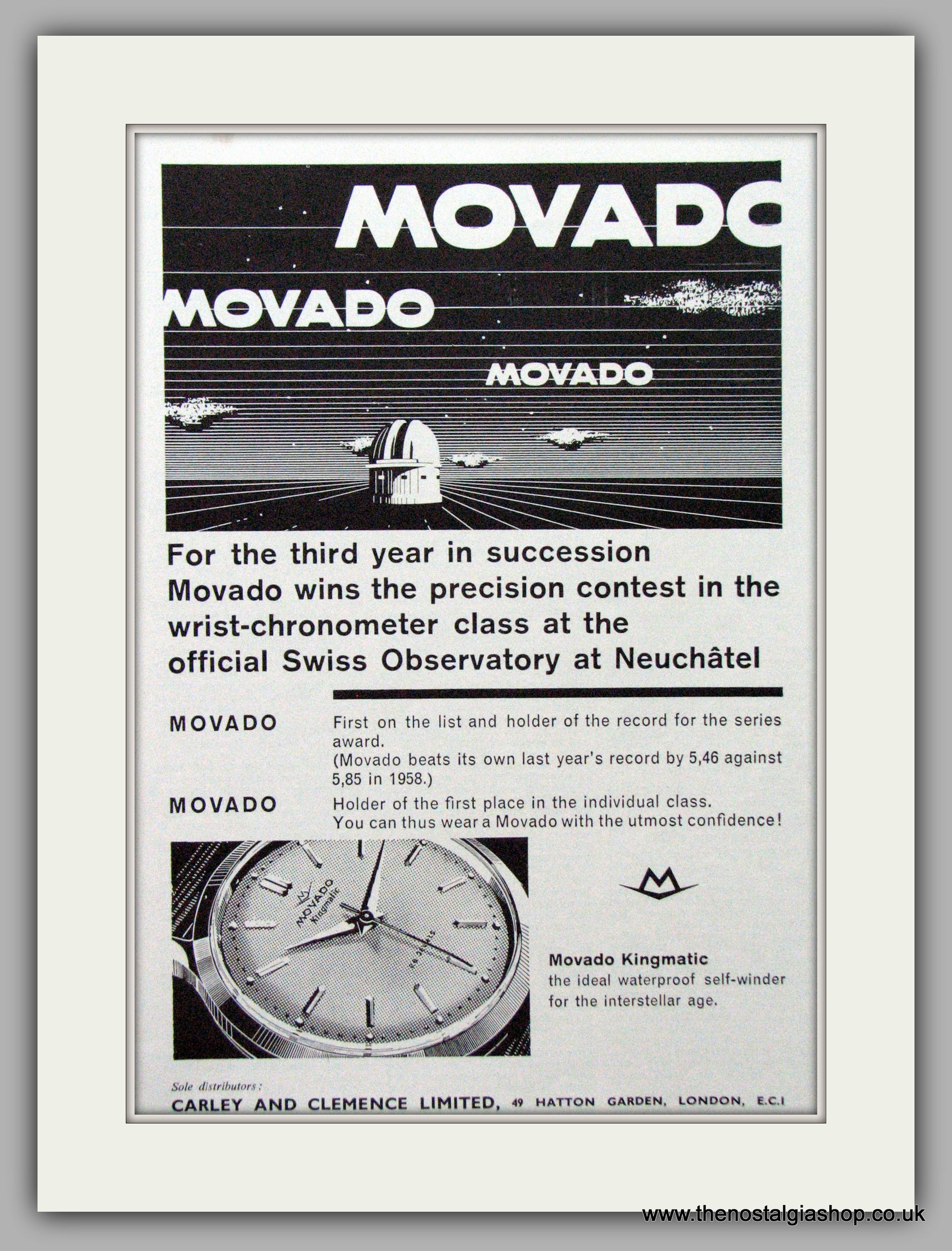 Movado Watches. Movado Kingsmatic. Vintage Advert. Original Advert 1959. Presented in cream bevel cut mount with backing card and clear bag. Ready to fit in 14 x 11 inch frame. Want it framing? If so, buy this then go to Frames Available Category. Click to buy on the suitable frame(s) and we will do the rest. All our adverts, unless clearly stated are Originals from the date shown. They make excellent pieces of wall art and stunning gifts. Many are rare and hard to find and once sold, may not be replaced. Remember you are buying a piece of history. Website watermark is not on original.