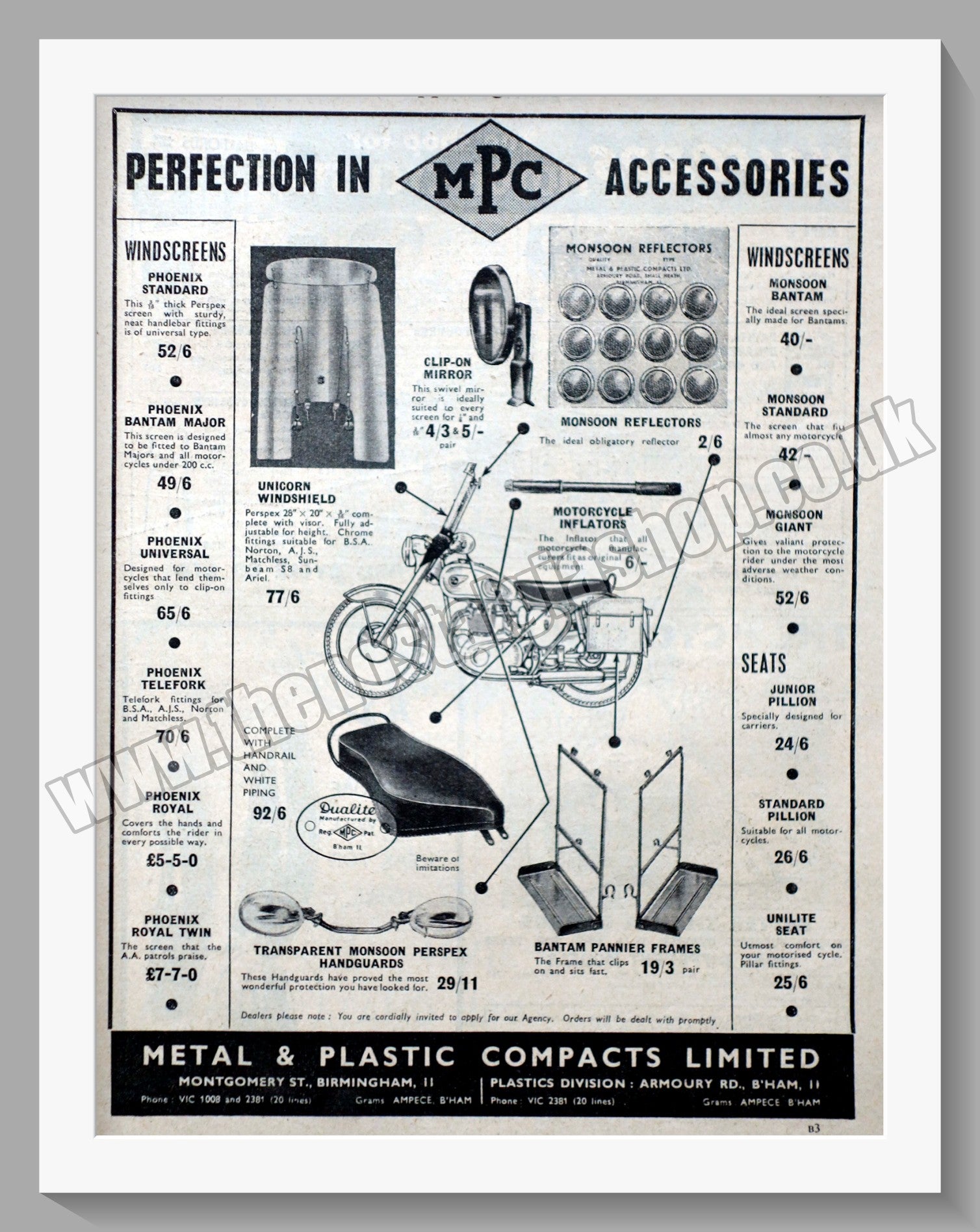 MPC Motorcycle Accessories. Original Vintage Advert 1955. Presented and Supplied in a 14 x 11 Inch, cream bevel cut mount with backing card and clear bag. Ready to frame. All our adverts, unless clearly stated are Originals from the date shown They make excellent pieces of wall art and stunning gifts. Many are rare and hard to find and once sold, may not be replaced. Remember you are buying a piece of history. Website watermark is not on original. Motorcycle Accessories.
