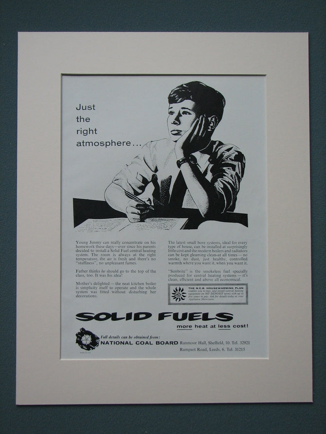 National Coal Board - Solid Fuels Solid Fuels, more heat at less cost! Classic original advert 1961. Professionally sealed and presented in cream bevel cut mount with backing card. Ready to fit in 14 x 11 inch frame. Want it framing? buy this then go to Frames Available Catagory. Click to buy on the suitable frame and we will do the rest. All our adverts, unless clearly stated are Originals from the date shown They make excellent pieces of wall art and stunning gifts. Many are rare and hard to find and once sold, may not be replaced. Remember you are buying a piece of history