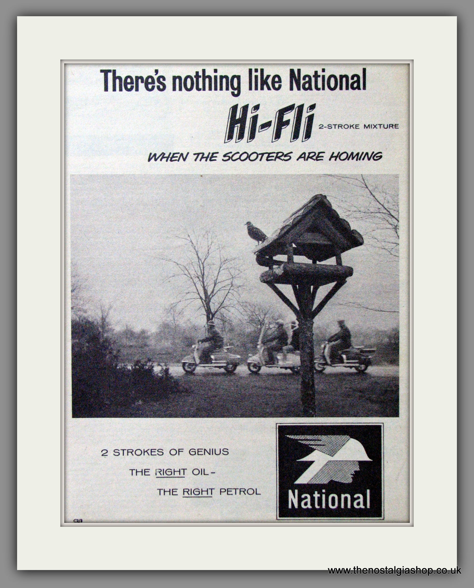 National Hi Fli Two Stroke Mixture. Scooter Fuel. Vintage Original Advert from 1960. Presented and Supplied in cream bevel cut mount with backing board and clear bag. Made to fit straight into 14 by 11 inch frame. All our Adverts, unless clearly stated are Original and from the year stated. They are NOT modern reprints. Many are difficult to get hold of , some are very rare and once sold may not be replaced, Remember, you are buying a piece of historic nostalgia. Lots more adverts available. Please contact us if you don't see the advert you want. Scooters. Mods.