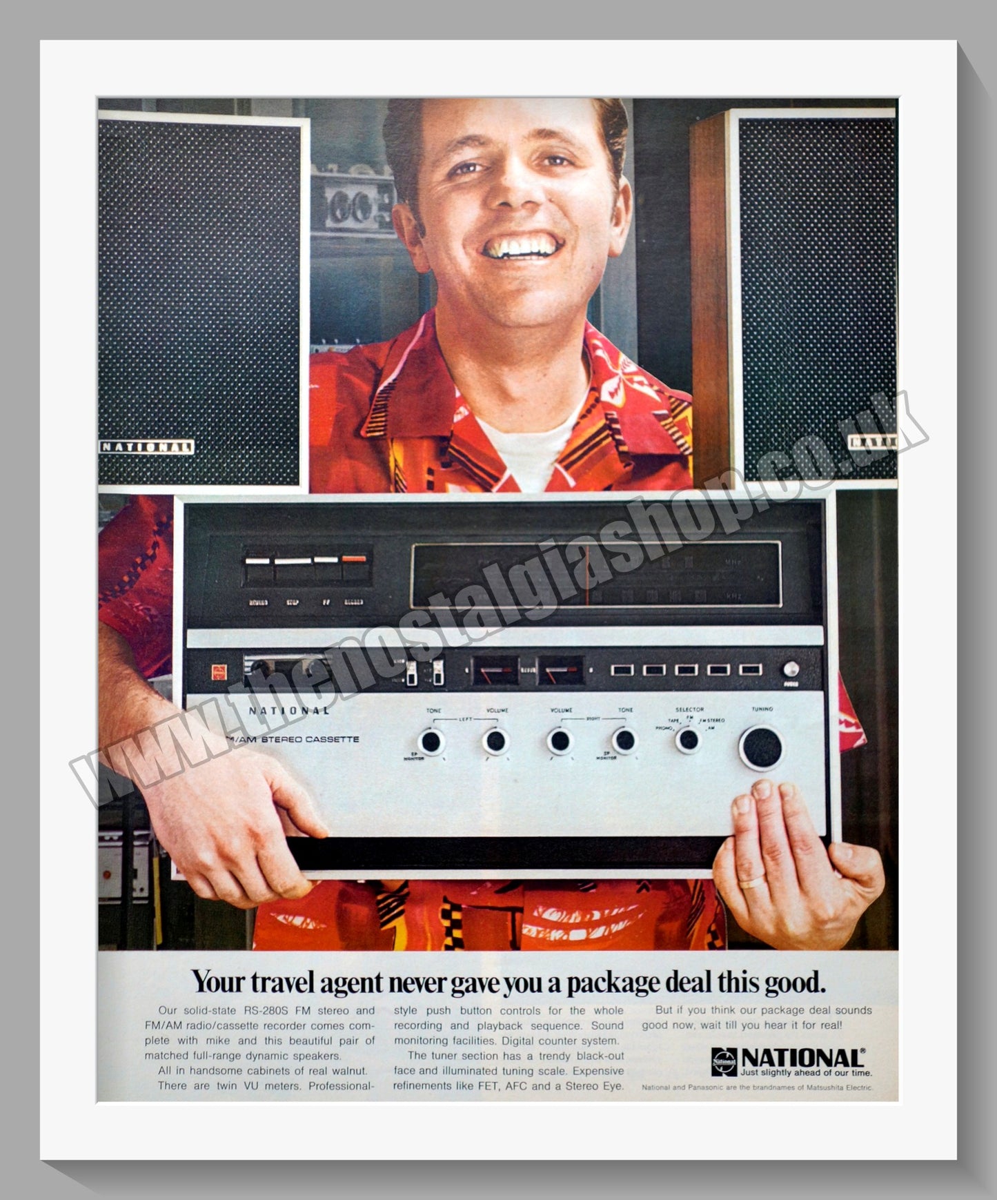 National RS 280S Stereo. Vintage Advert. This is a large classic Original advert 1970. Presented and Supplied in a cream bevel cut mount with backing card and clear bag. Ready to fit in 18 x 14 inch frame. The mounted advert will be posted via courier and well packed - protected with a sheet of hardboard to keep it rigid. Any questions or inquiries, please get in touch, we are here to help! All our adverts, unless clearly stated are Originals from the date shown. They make excellent pieces of wall art and stunning gifts. Many are rare and hard to find and once sold, may not be replaced. Remember you are buying a piece of history. Website watermark is not on original .