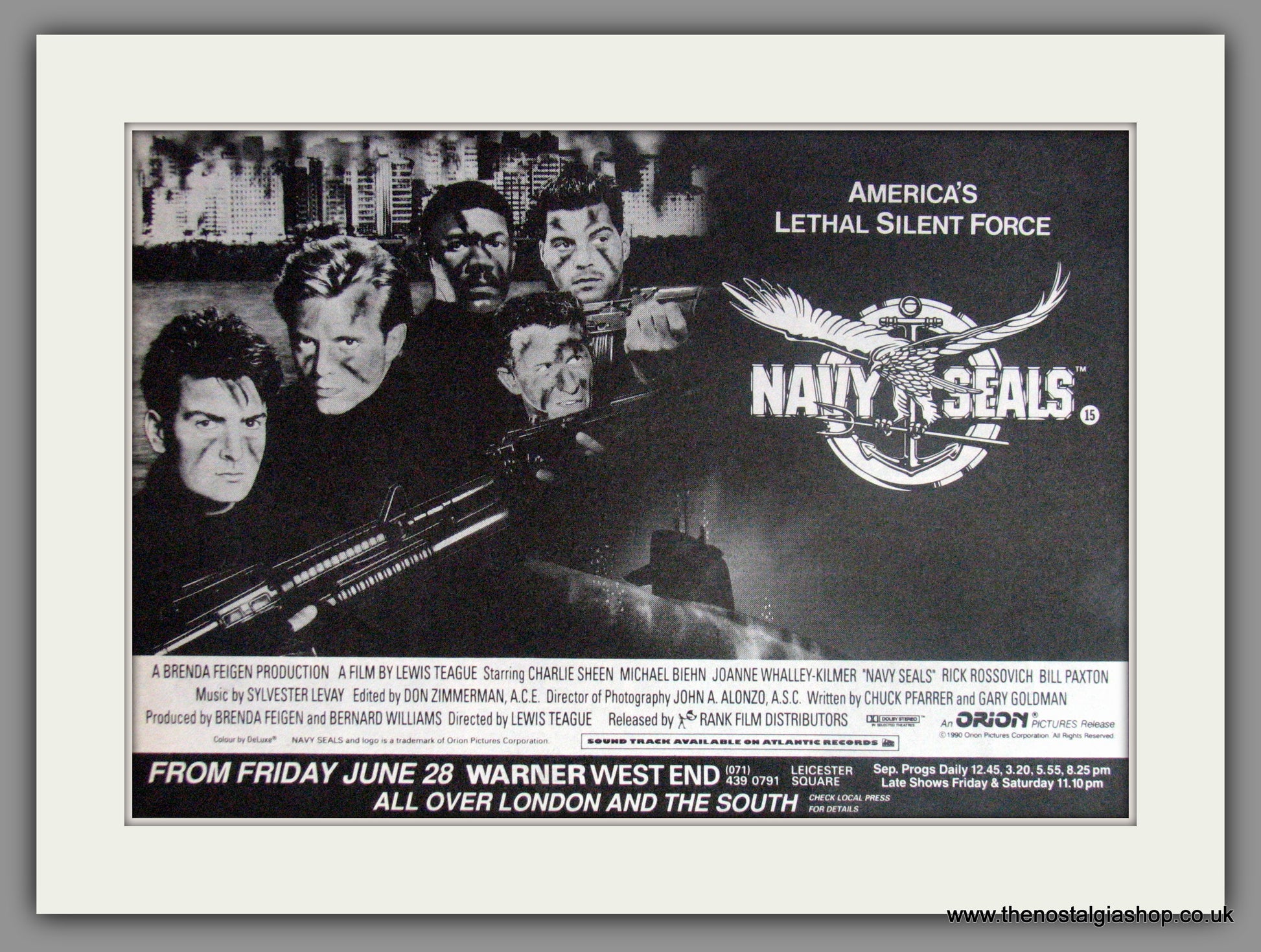 Navy Seals-Charlie Sheen, Michael Biehn, Joanne Whalley-Kilmer. Vintage Advert. Classic original advert 1991. Presented in cream bevel cut mount with backing card and display bag. Ready to fit in 14 x 11 inch frame. Want it framing? If so, buy this then go to Frames Available Category. Click to buy on the suitable frame and we will do the rest. All our adverts, unless clearly stated are Originals from the date shown. They make excellent pieces of wall art and stunning gifts. Many are rare and hard to find and once sold, may not be replaced. Remember you are buying a piece of history. Website watermark is not on original.