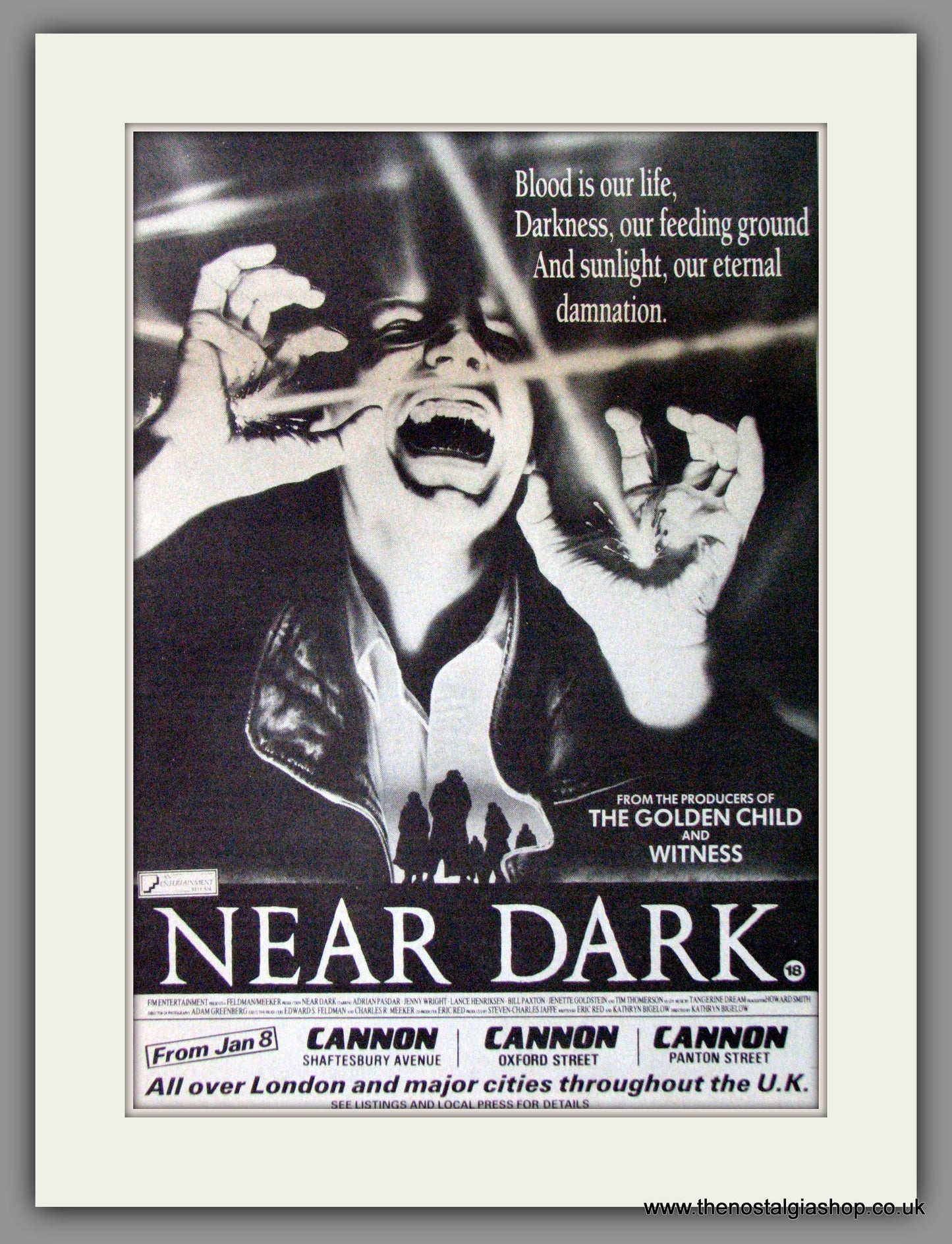 Near Dark, Adrian Pasdar, Jenny Wright. Classic original advert 1986. Presented and Supplied in cream bevel cut mount with backing card and clear bag. Ready to fit in 14 x 11 inch frame. Want it framing? If so, buy this then go to Frames Available Category. Click to buy on the suitable frame and we will do the rest. All our adverts, unless clearly stated are Originals from the date shown. They make excellent pieces of wall art and stunning gifts. Many are rare and hard to find and once sold, may not be replaced. Remember you are buying a piece of history. Website watermark is not on original.
