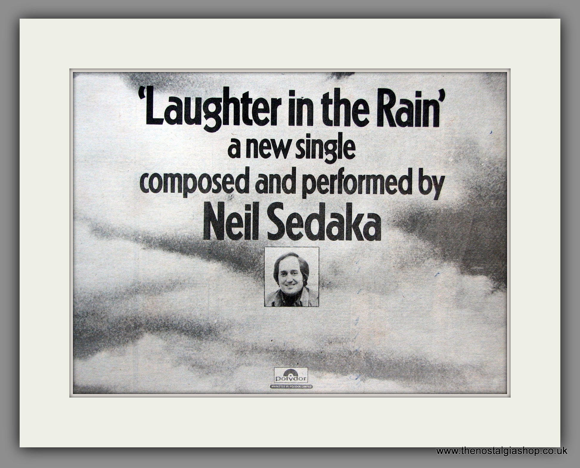 Neil Sedaka. Laughter In The Rain. Classic Original advert 1974. Presented in cream bevel cut mount with backing card and clear bag. Ready to fit in 14 x 11 inch frame. Want it framing? If so, buy this then go to Frames Available Category. Click to buy on the suitable frame and we will do the rest. All our adverts, unless clearly stated are Originals from the date shown. They make excellent pieces of wall art and stunning gifts. Many are rare and hard to find and once sold, may not be replaced. Remember you are buying a piece of history. Website watermark is not on original.