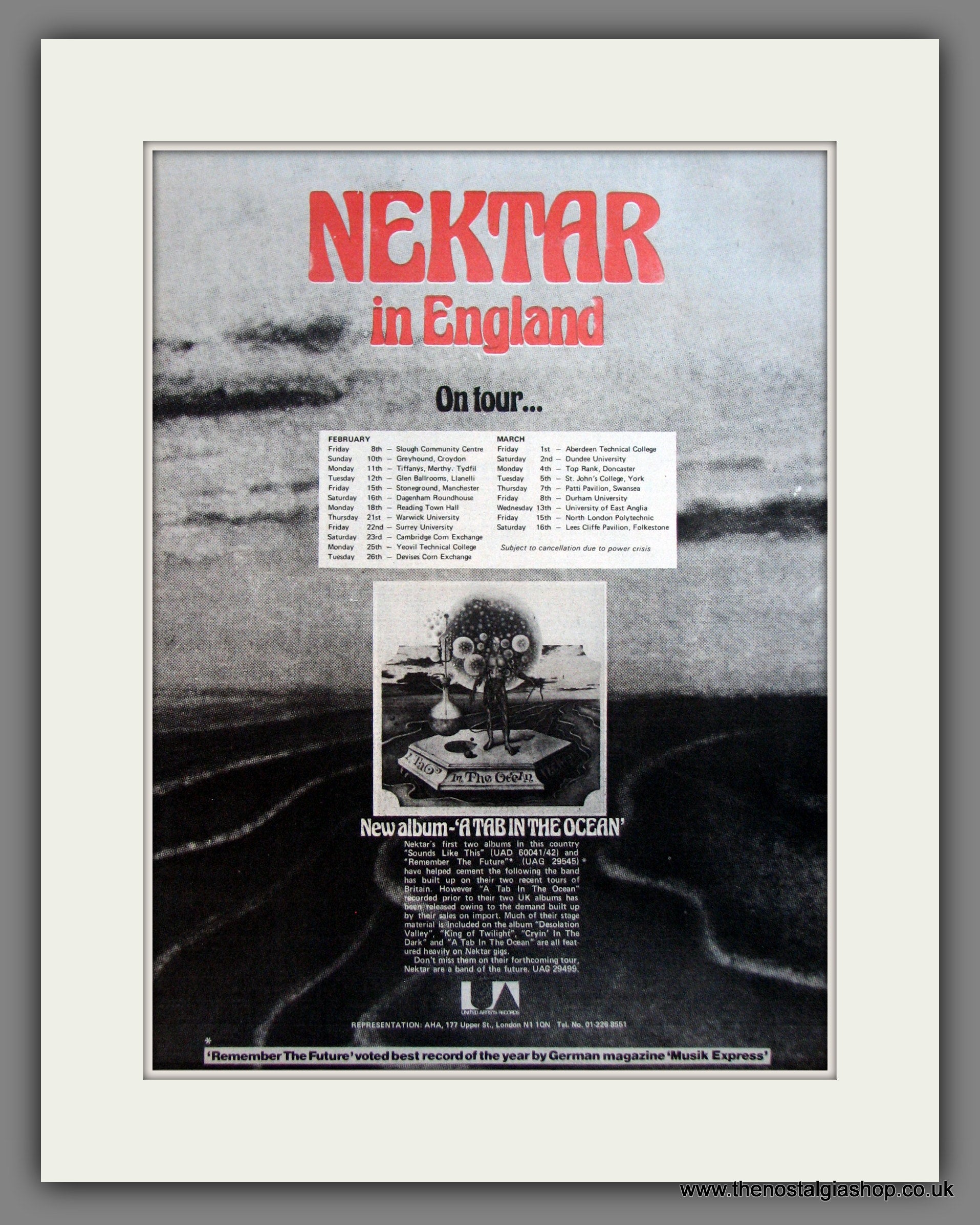 Nektar, UK Tour. Original Advert 1974 (ref AD11942). Presented and supplied in a cream bevel cut mount with backing card and clear bag. Ready to fit in a 20x16 inch frame. The mounted advert will be posted via courier and well packed - protected with a sheet of hardboard to keep it rigid. Any questions or enquiries, please get in touch, we are here to help! All our adverts, unless clearly stated are originals from the date shown. They make excellent pieces of wall art and stunning gifts. Many are rare and hard to find and once sold, may not be replaced. Remember you are buying a piece of history. Website watermark is not on original.