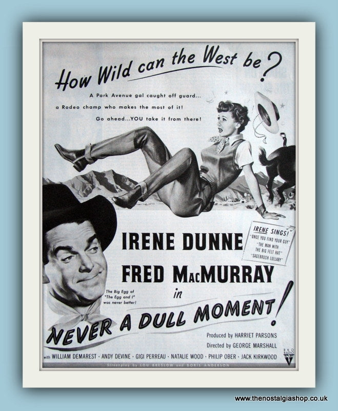 Never A Dull Moment. How Wild Can The West Be ? Starring Irene Dunne, Fred MacMurray, Natalie Wood. Classic original advert 1950. Presented in a 20 x 16 Inch cream mount with backing board and clear bag. All our adverts, unless clearly stated are Originals from the date shown. They make excellent pieces of wall art and stunning gifts. Many are rare and hard to find and once sold, may not be replaced. Remember you are buying a piece of history. Website watermarks are not on original.