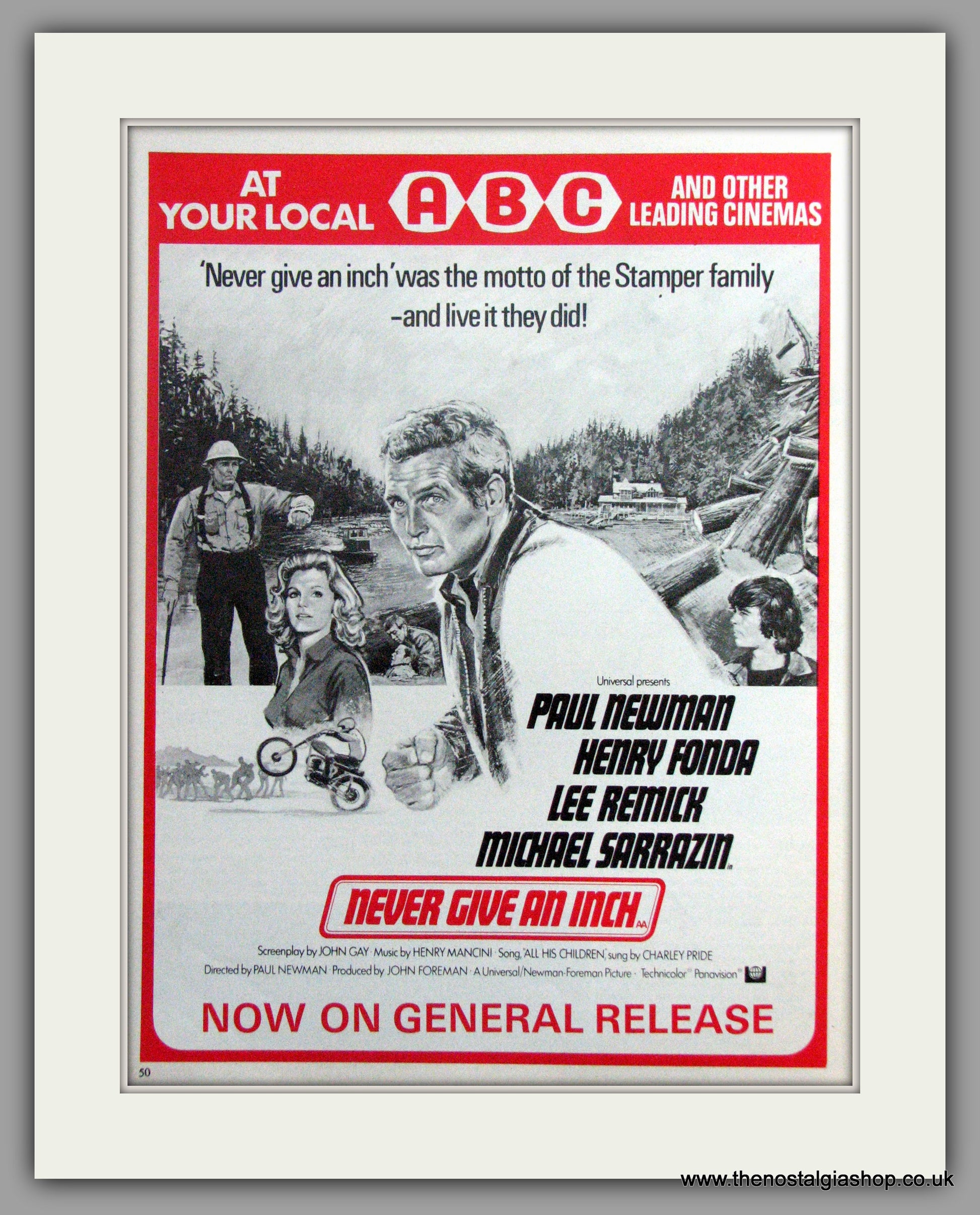 Never Give An Inch. Paul Newman, Henry Fonda, Lee Remick. Vintage Advert. Classic original advert 1972. Presented in cream bevel cut mount with backing card and display bag. Ready to fit in 14 x 11 inch frame. Want it framing? If so, buy this then go to Frames Available Category. Click to buy on the suitable frame and we will do the rest. All our adverts, unless clearly stated are Originals from the date shown. They make excellent pieces of wall art and stunning gifts. Many are rare and hard to find and once sold, may not be replaced. Remember you are buying a piece of history. Website watermark is not on original.