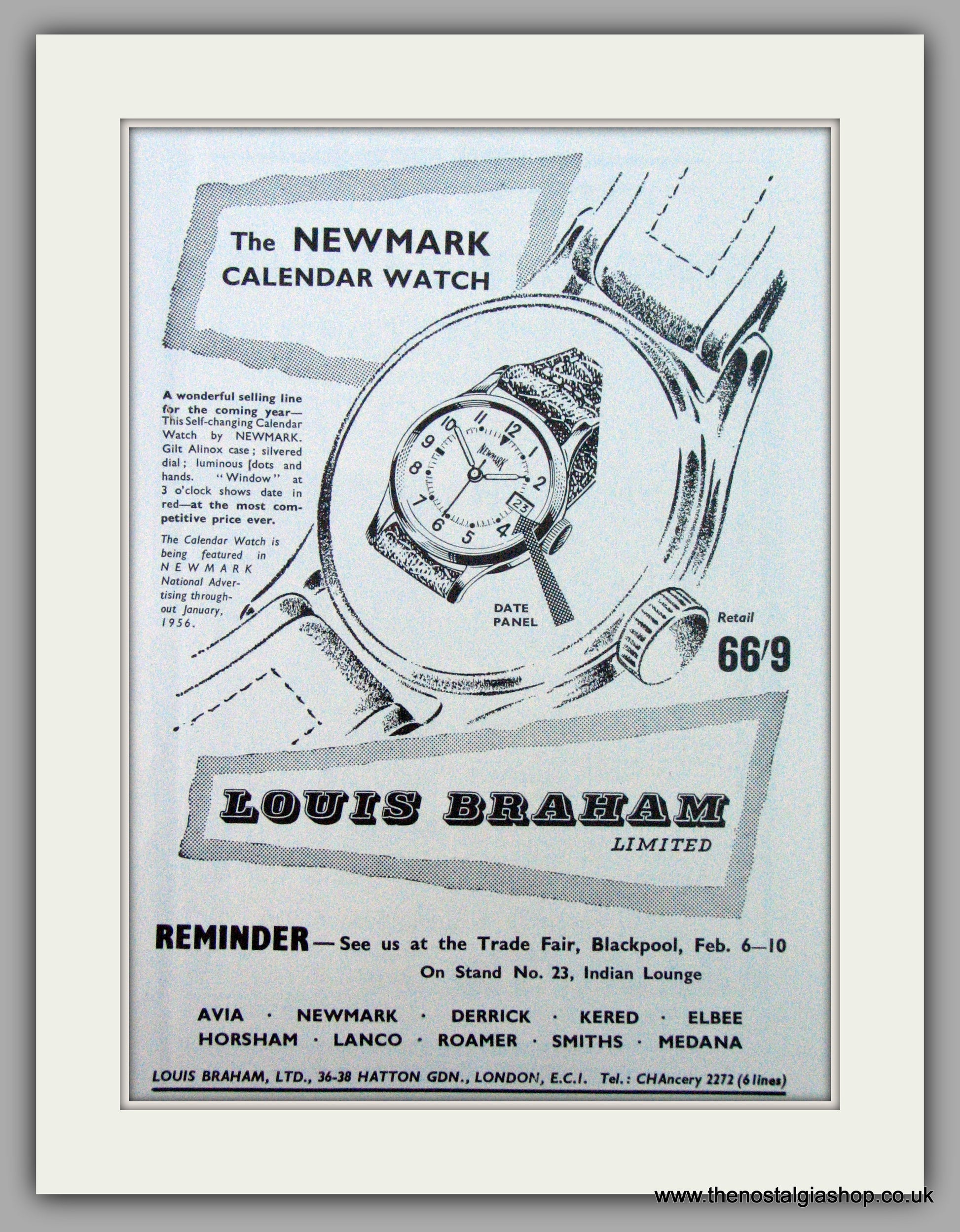 Newmark Calendar Watches. The Newmark calendar watch. Vintage Advert. Classic Original advert 1956. Presented in cream bevel cut mounts with backing card and clear bag. Ready to fit in 14 x 11 inch frame. Want it framing? If so, buy this then go to Frames Available Category. Click to buy on the suitable frame(s) and we will do the rest. All our adverts, unless clearly stated are Originals from the date shown. They make excellent pieces of wall art and stunning gifts. Many are rare and hard to find and once sold, may not be replaced. Remember you are buying a piece of history. Website watermark is not on original.