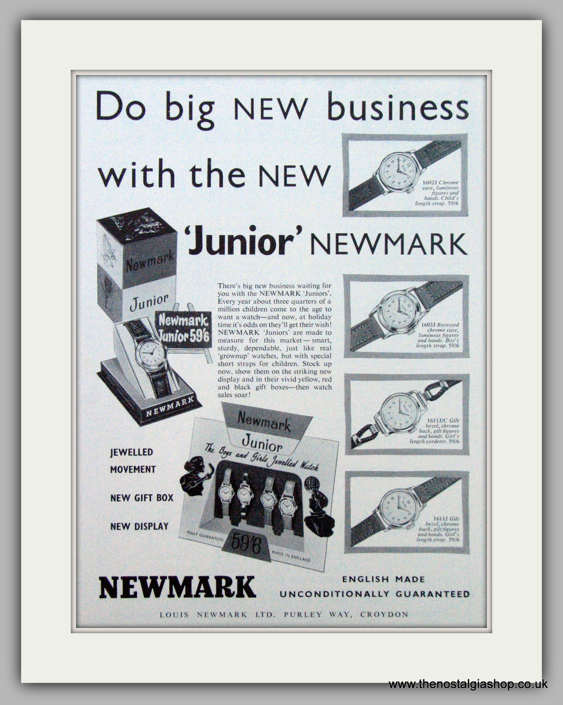 Newmark Junior Watches. Do big new business with the new Junior Newmark. Vintage Advert. Classic Original advert 1956. Presented in cream bevel cut mounts with backing card and clear bag. Ready to fit in 14 x 11 inch frame. Want it framing? If so, buy this then go to Frames Available Category. Click to buy on the suitable frame(s) and we will do the rest. All our adverts, unless clearly stated are Originals from the date shown. They make excellent pieces of wall art and stunning gifts. Many are rare and hard to find and once sold, may not be replaced. Remember you are buying a piece of history. Website watermark is not on original.
