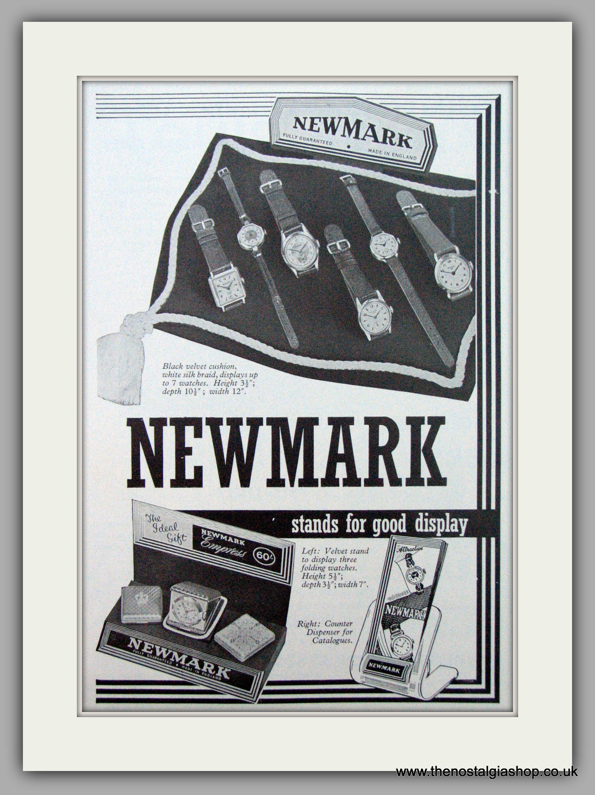 Newmark Watches. Newmark stands for good display. Vintage Advert. Classic Original advert 1953. Presented in cream bevel cut mounts with backing card and clear bag. Ready to fit in 14 x 11 inch frame. Want it framing? If so, buy this then go to Frames Available Category. Click to buy on the suitable frame(s) and we will do the rest. All our adverts, unless clearly stated are Originals from the date shown. They make excellent pieces of wall art and stunning gifts. Many are rare and hard to find and once sold, may not be replaced. Remember you are buying a piece of history. Website watermark is not on original.