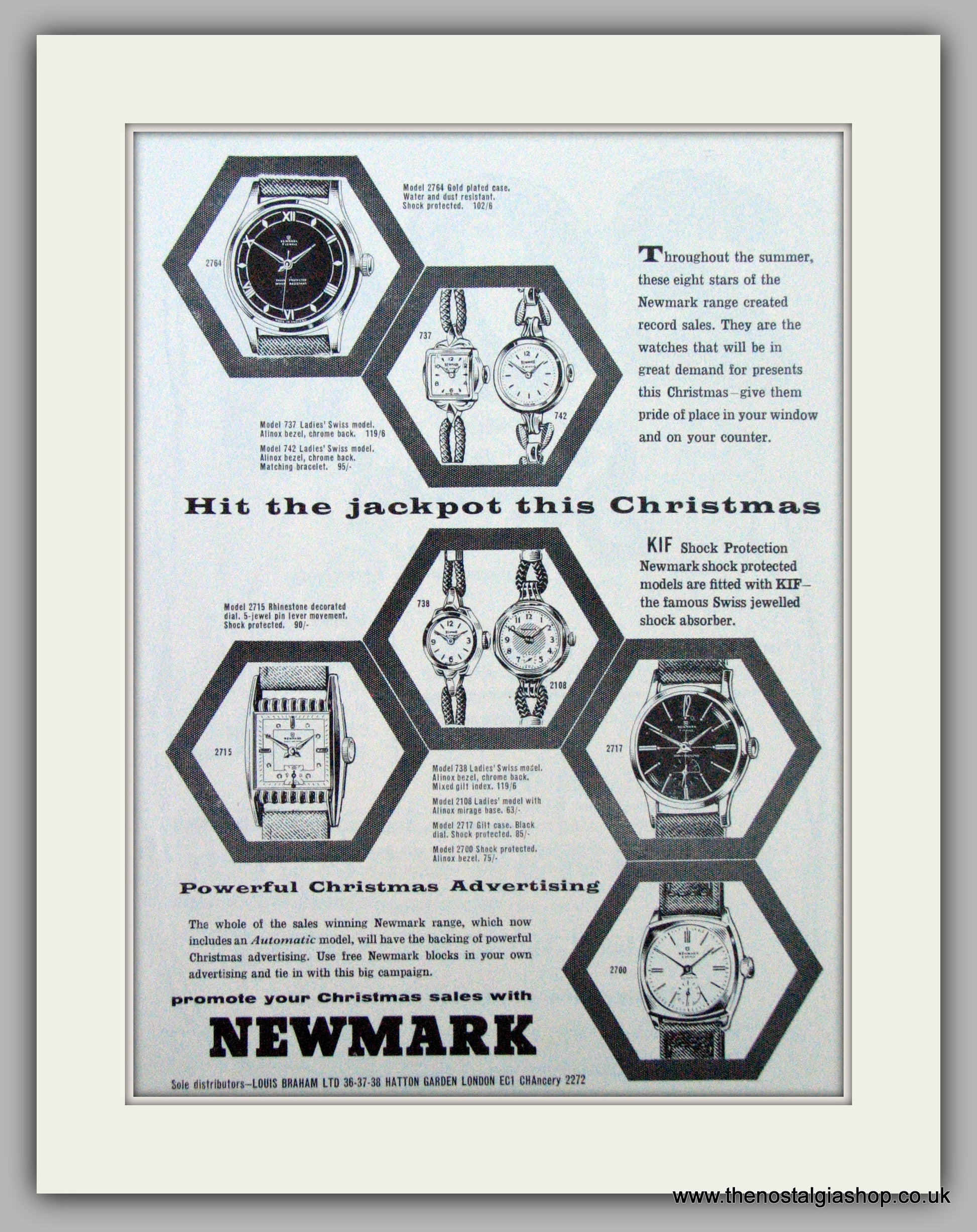Newmark Watches for Christmas. Set of 2 Vintage Adverts. Classic Original advert 1958. Presented in cream bevel cut mounts with backing card and clear bag. Ready to fit in 14 x 11 inch frame. Want them framing? If so, buy this then go to Frames Available Category. Click to buy on the suitable frame(s) and we will do the rest. All our adverts, unless clearly stated are Originals from the date shown. They make excellent pieces of wall art and stunning gifts. Many are rare and hard to find and once sold, may not be replaced. Remember you are buying a piece of history. Website watermark is not on original.