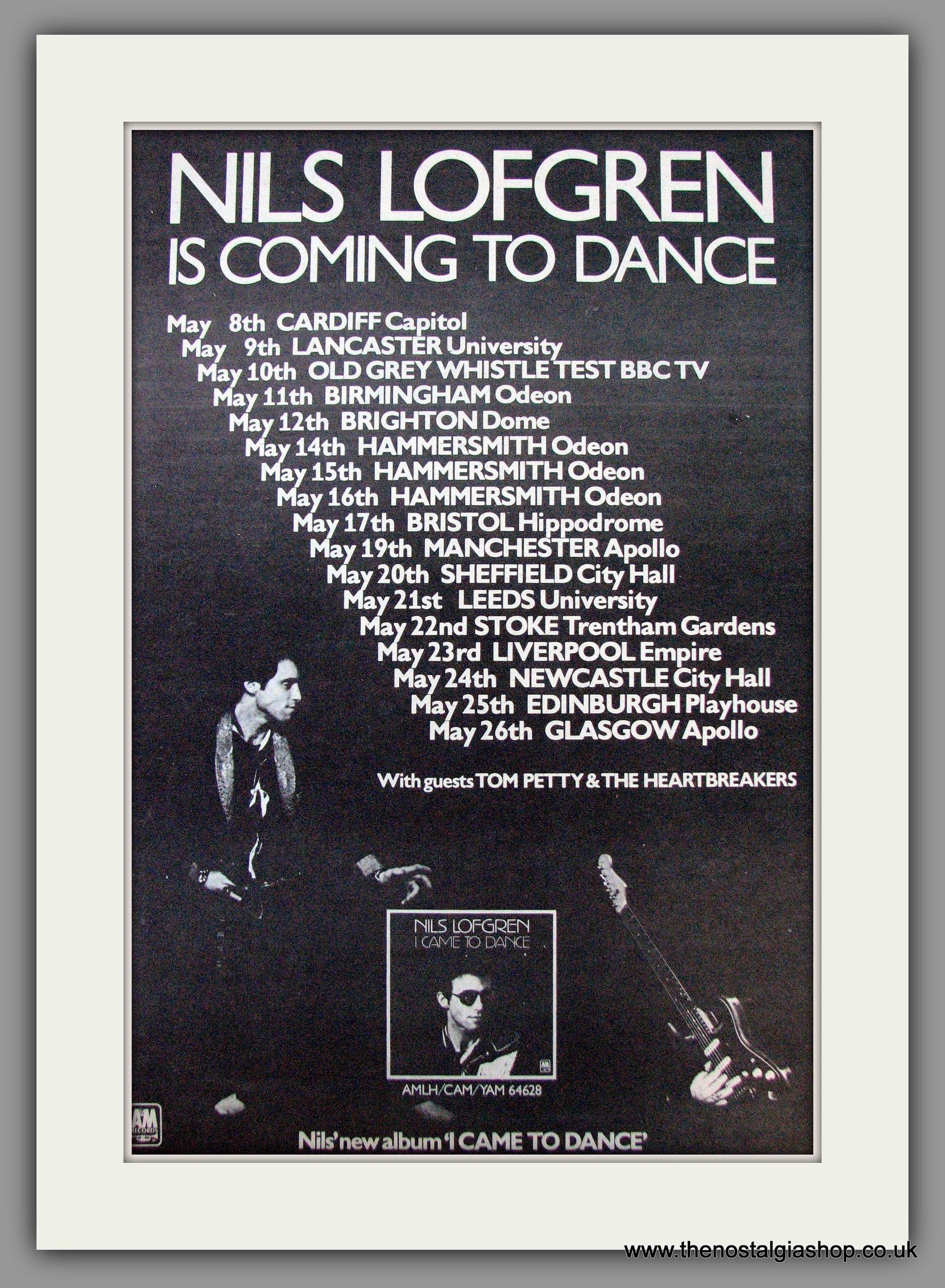 Nils Lofgren. UK Tour Dates. Vintage Advert. This is a large classic Original advert 1977. Presented in cream bevel cut mount with backing card and clear bag. Ready to fit in 20 x 16 inch frame. The mounted advert will be posted via courier and well packed - protected with a sheet of hardboard to keep it rigid. Any questions or inquiries, please get in touch, we are here to help! All our adverts, unless clearly stated are Originals from the date shown. They make excellent pieces of wall art and stunning gifts. Many are rare and hard to find and once sold, may not be replaced. Remember you are buying a piece of history. Website watermark is not on original .