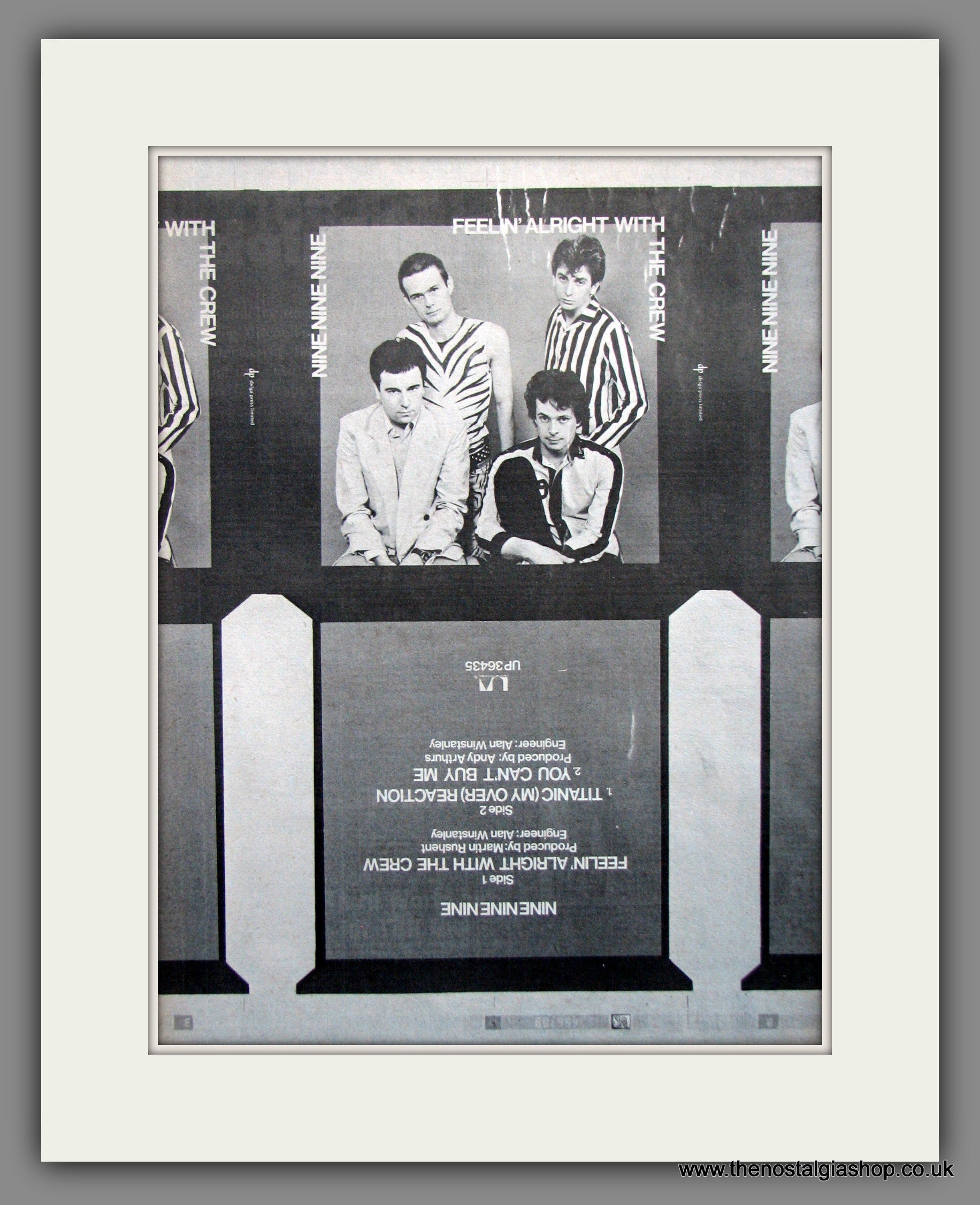 Nine Nine Nine. Feelin' Alright With The Crew. Original Advert 1978 (ref AD11933). Presented and supplied in a cream bevel cut mount with backing card and clear bag. Ready to fit in a 20x16 inch frame. The mounted advert will be posted via courier and well packed - protected with a sheet of hardboard to keep it rigid. Any questions or enquiries, please get in touch, we are here to help! All our adverts, unless clearly stated are originals from the date shown. They make excellent pieces of wall art and stunning gifts. Many are rare and hard to find and once sold, may not be replaced. Remember you are buying a piece of history. Website watermark is not on original.