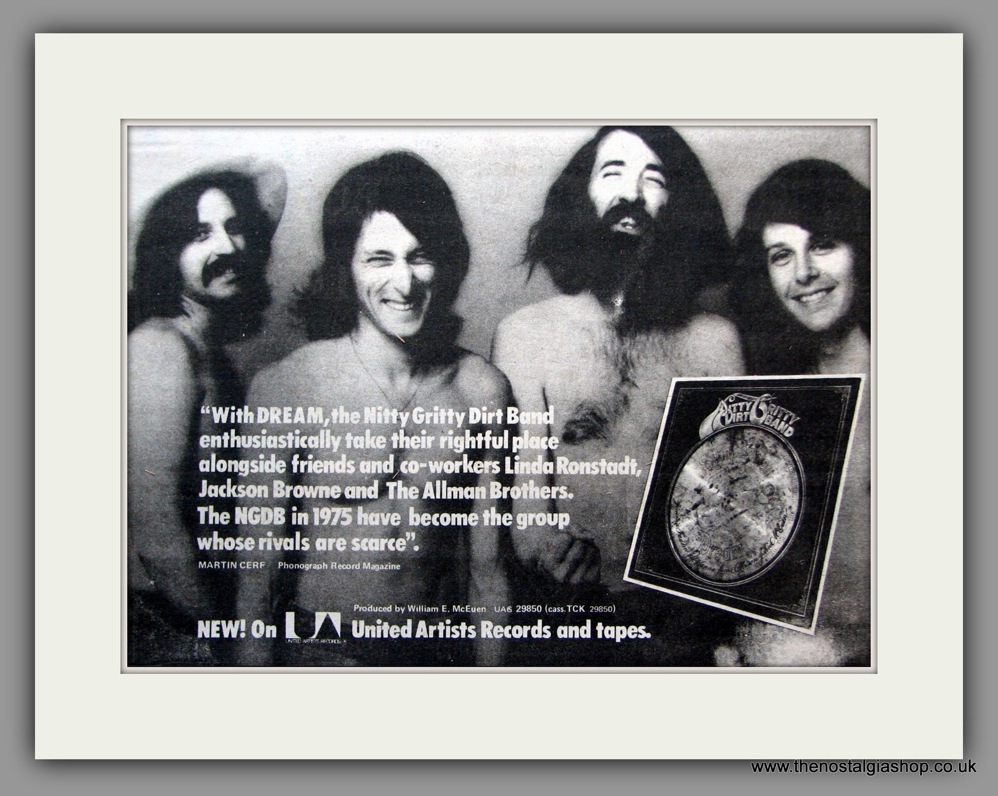 Nitty Gritty Dirt Band, Dream. Classic Original advert 1975. Presented in cream bevel cut mount with backing card and clear bag. Ready to fit in 14 x 11 inch frame. Want it framing? If so, buy this then go to Frames Available Category. Click to buy on the suitable frame and we will do the rest. All our adverts, unless clearly stated are Originals from the date shown. They make excellent pieces of wall art and stunning gifts. Many are rare and hard to find and once sold, may not be replaced. Remember you are buying a piece of history. Website watermark is not on original.