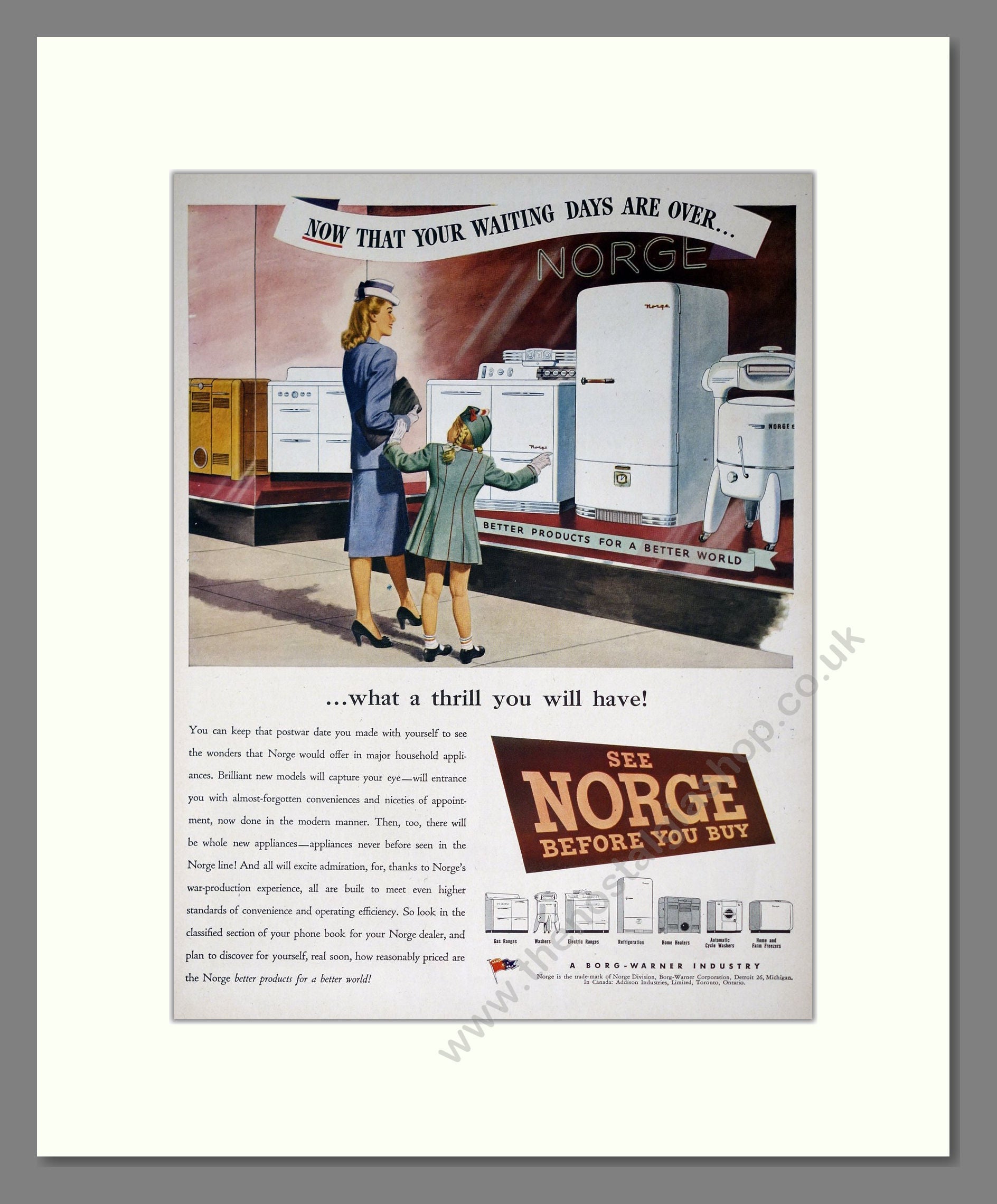 Norge - Kitchen Appliances. Vintage Advert. This is a large classic original advert from 1946. Presented and supplied in a cream bevel cut mount with backing card and clear bag. Ready to fit in a 18 x 14 inches frame. The mounted advert will be posted via courier and well packed - protected with a sheet of hardboard to keep it rigid. Any questions or enquiries, please get in touch, we are here to help! All our adverts, unless clearly stated are originals from the date shown. They make excellent pieces of wall art and stunning gifts. Many are rare and hard to find and once sold, may not be replaced. Remember you are buying a piece of history. Website watermark is not on original.