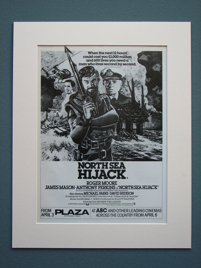 North Sea Hijack. Roger Moore, James Mason, Anthony Perkins. Original advert 1980. Presented in cream bevel cut mount with backing card. Ready to fit in 14 x 11 inch frame. Want it framing? buy this then go to Frames Available Category. Click to buy on the suitable frame and we will do the rest. All our adverts, unless clearly stated are Originals from the date shown They make excellent pieces of wall art and stunning gifts. Many are rare and hard to find and once sold, may not be replaced. Remember you are buying a piece of history.