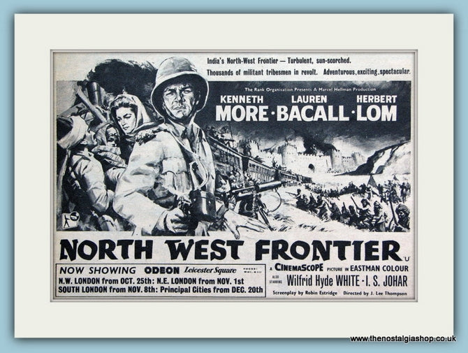 North West Frontier. Featuring Kenneth More, Lauren Bacall, Herbert Lom, Wilfred Hyde White. Classic original film advert 1959. Presented in cream bevel cut mount with backing card and clear bag. Ready to fit in 12 x 10 inch frame. Want it framing? If so, buy this then go to Frames Available Catagory. Click to buy on the suitable frame and we will do the rest. All our adverts, unless clearly stated are Originals from the date shown. They make excellent pieces of wall art and stunning gifts. Many are rare and hard to find and once sold, may not be replaced. Remember you are buying a piece of history. Website watermark is not on original.