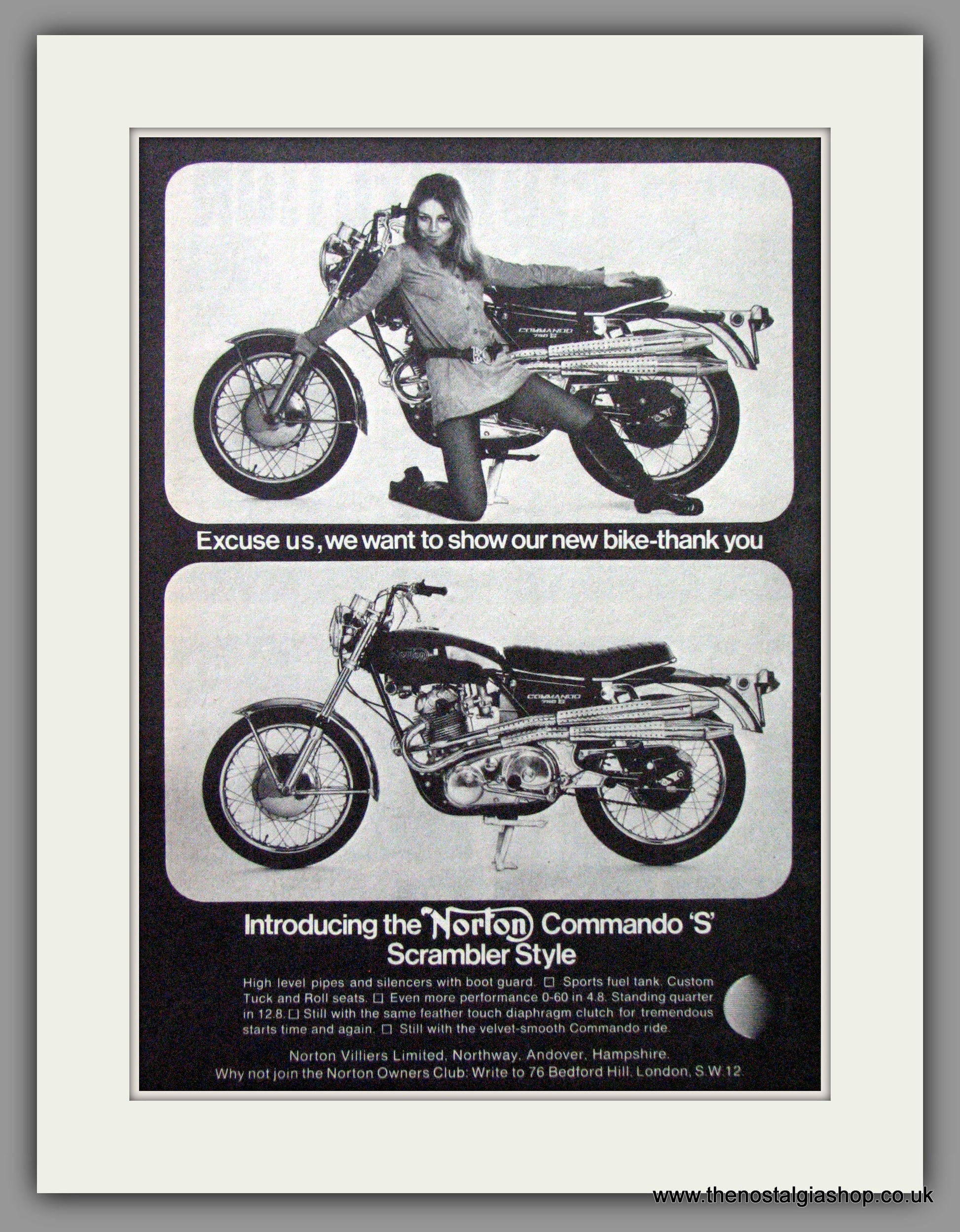 Norton Motorcycles. Norton Commando S Scrambler Style. Classic Original Vintage advert 1969. Presented in cream bevel cut mount with backing card and clear bag. Ready to fit in 14 x 11 inch frame. Want it framing? If so, buy this then go to Frames Available Category. Click to buy on the suitable frame and we will do the rest. All our adverts, unless clearly stated are Originals from the date shown. They make excellent pieces of wall art and stunning gifts. Many are rare and hard to find and once sold, may not be replaced. Remember you are buying a piece of history. Website watermark is not on original.