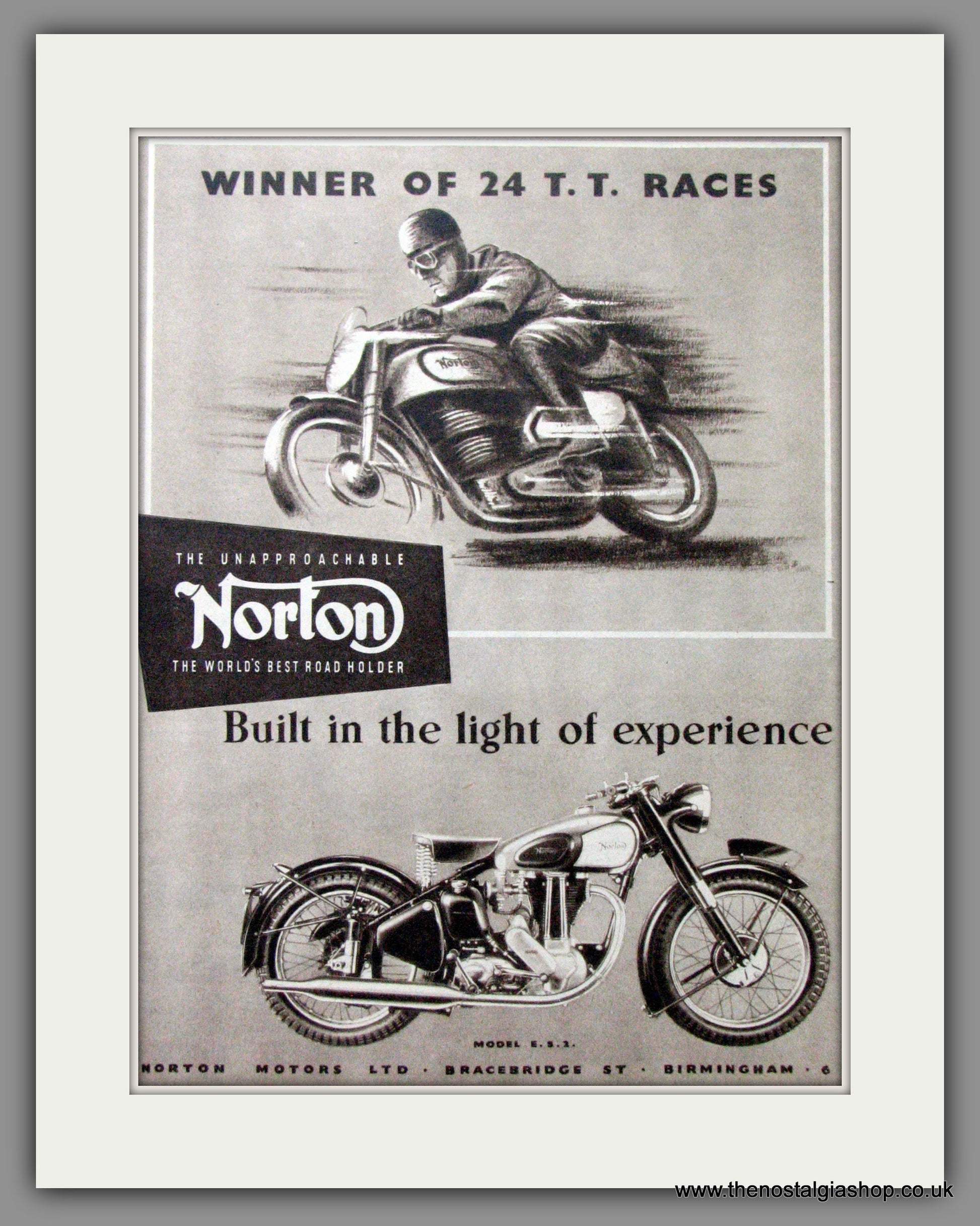 Norton Motorcycles. Winner of 24 TT races Norton ES2. Classic Original Vintage advert 1951. Presented in cream bevel cut mount with backing card and clear bag. Ready to fit in 14 x 11 inch frame. Want it framing? If so, buy this then go to Frames Available Category. Click to buy on the suitable frame and we will do the rest. All our adverts, unless clearly stated are Originals from the date shown. They make excellent pieces of wall art and stunning gifts. Many are rare and hard to find and once sold, may not be replaced. Remember you are buying a piece of history. Website watermark is not on original.