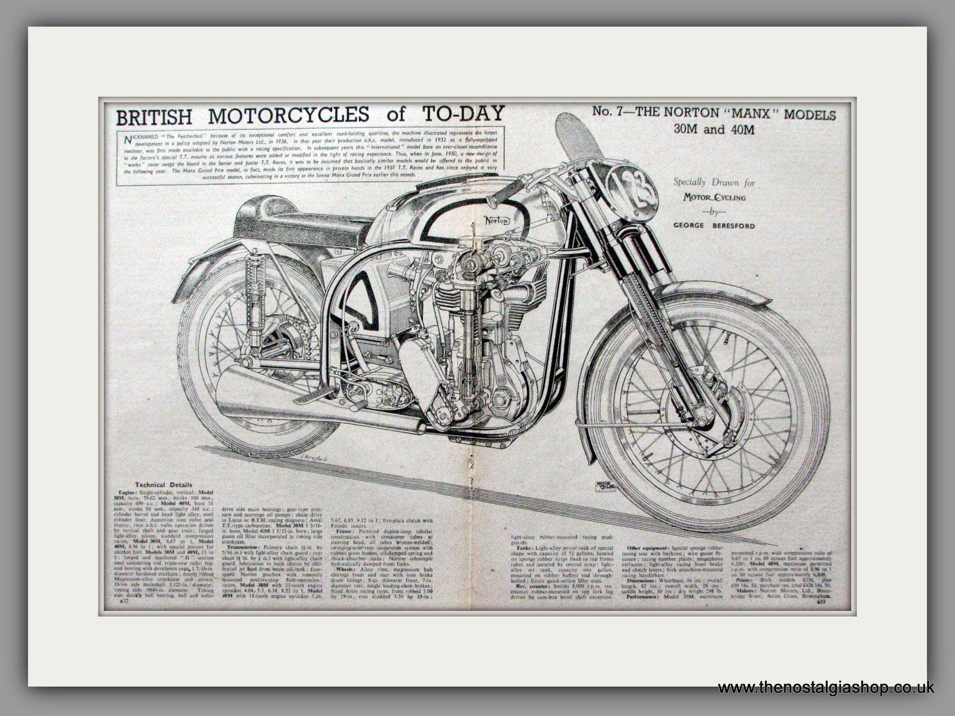 Norton Manx Models 30M and 40M, This is a double page spread Illustrated by George Beresford and shows Technical details 1951. Presented in cream bevel cut mount with backing card and clear bag. Ready to fit in 20 x 16 inch frame. Will be well packed with a sheet of hardboard for protection. All our adverts, unless clearly stated are Originals from the date shown. They make excellent pieces of wall art and stunning gifts. Many are rare and hard to find and once sold, may not be replaced. Remember you are buying a piece of history. Website watermark is not on original.