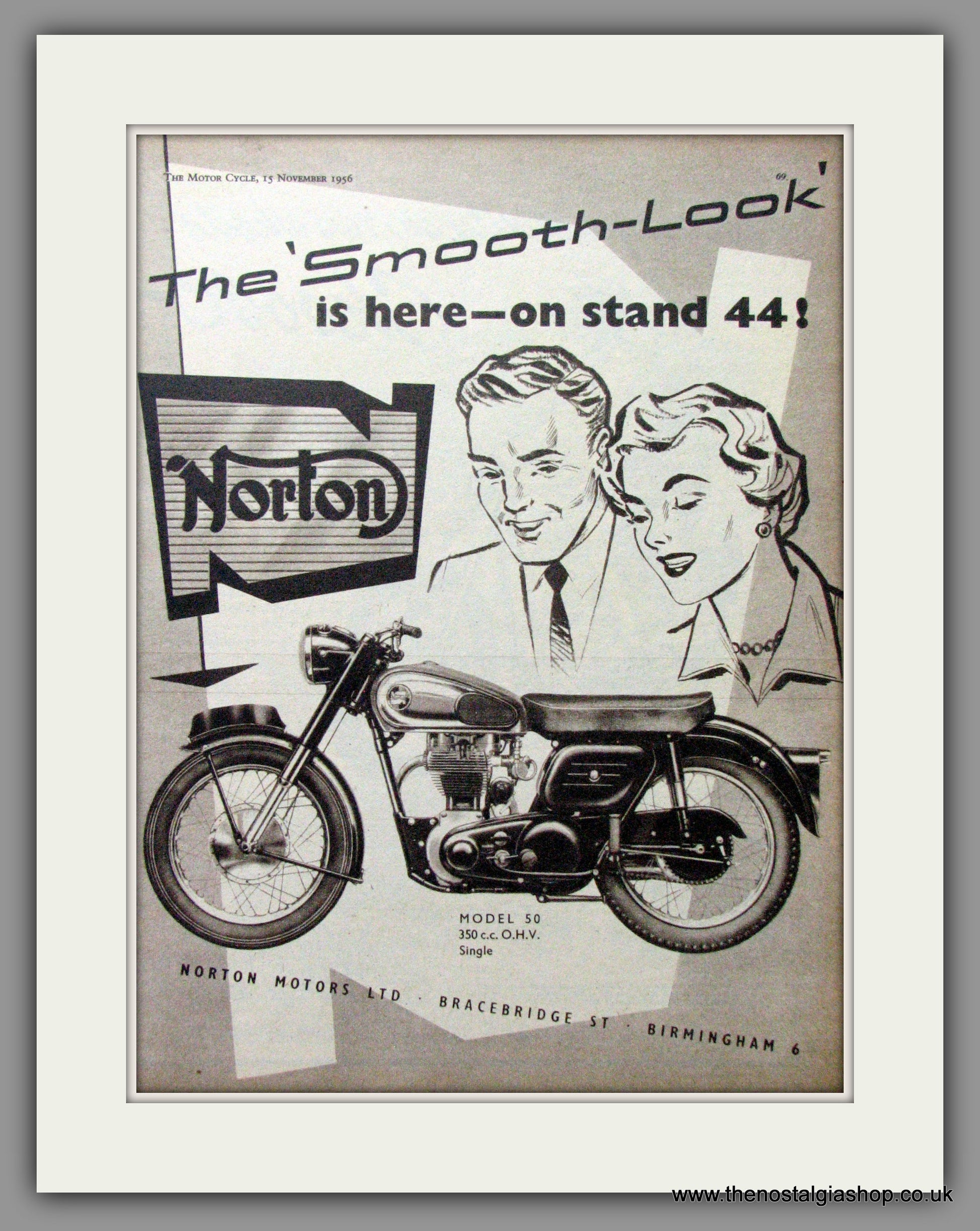 Norton Motorcycles. Norton Model 50 350cc O.H.V. Single. Classic Original Vintage advert 1956. Presented in cream bevel cut mount with backing card and clear bag. Ready to fit in 14 x 11 inch frame. Want it framing? If so, buy this then go to Frames Available Category. Click to buy on the suitable frame and we will do the rest. All our adverts, unless clearly stated are Originals from the date shown. They make excellent pieces of wall art and stunning gifts. Many are rare and hard to find and once sold, may not be replaced. Remember you are buying a piece of history. Website watermark is not on original.
