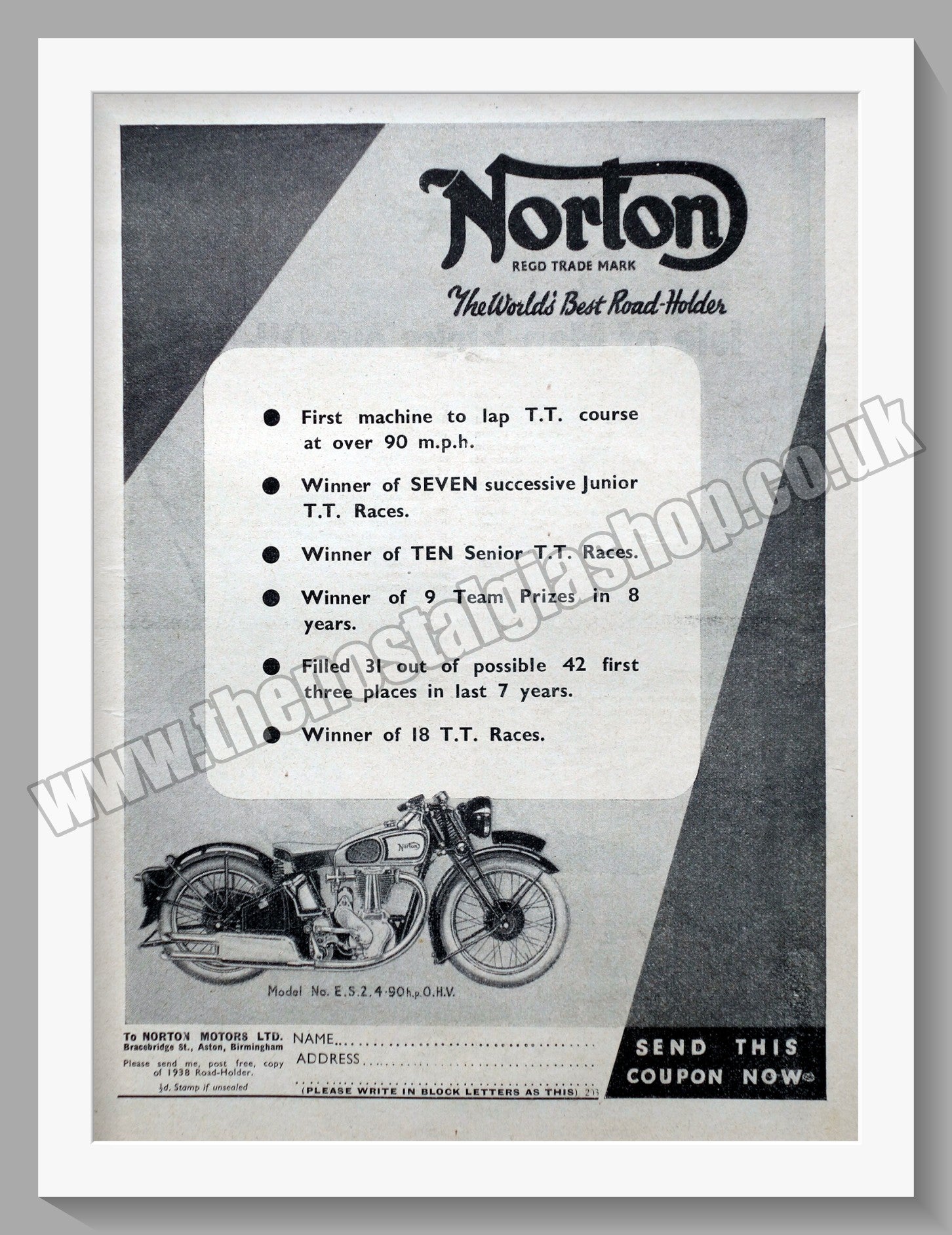 Norton Motorcycles. T.T. Triumphs. Classic Original Vintage advert 1938. Presented and Supplied in a 14 x 11 Inch, cream bevel cut mount with backing card and clear bag. Ready to frame. All our adverts, unless clearly stated are Originals from the date shown. They make excellent pieces of wall art and stunning gifts. Many are rare and hard to find and once sold, may not be replaced. Remember you are buying a piece of history. Website watermark is not on original. Norton Motors, Aston, Birmingham.